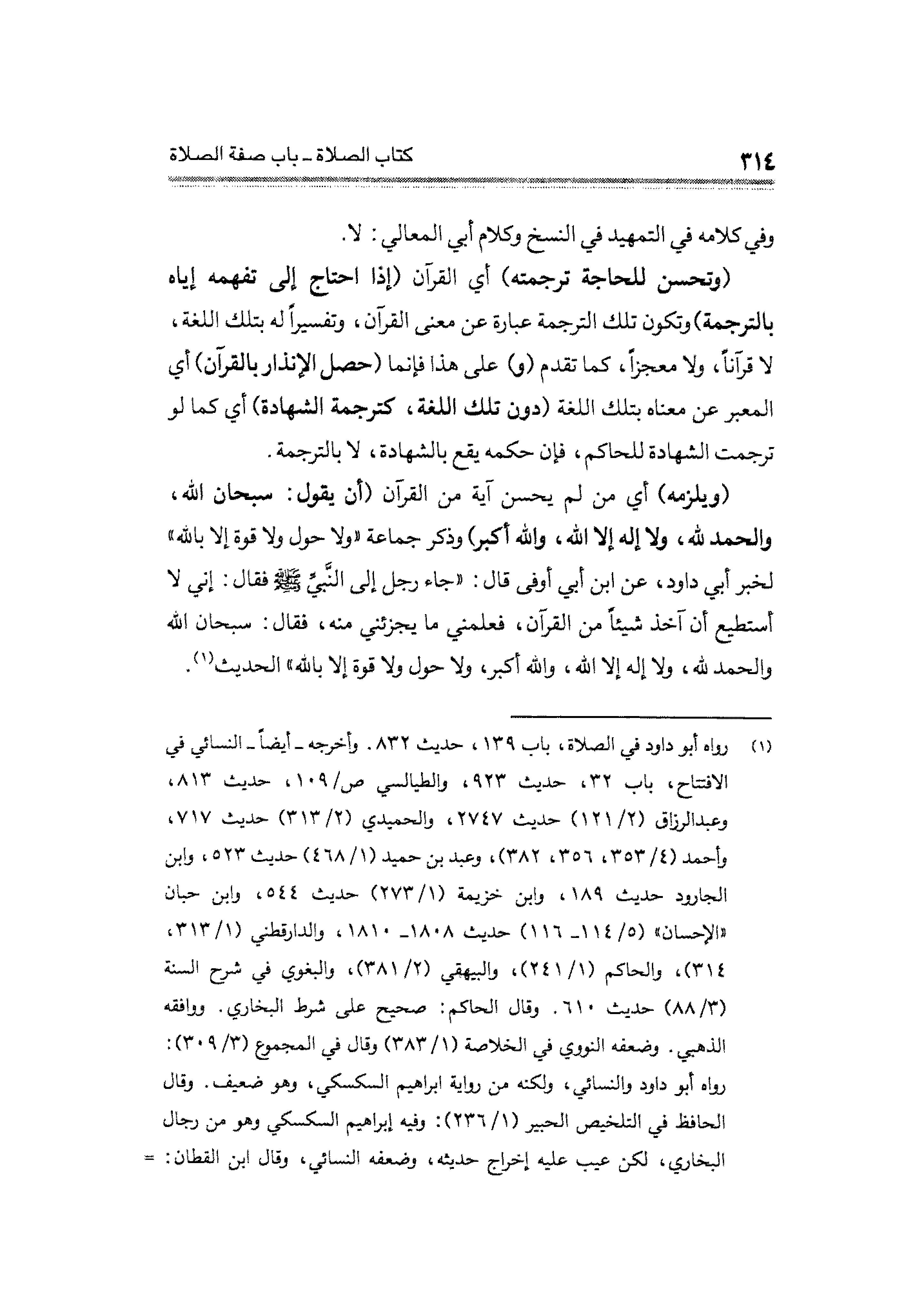 (وتحسن للحاجة ترجمته) أي القرآن (إذًا احتاج إلى تفهمه إياه بالترجمة) وتكون تلك الترجمة عبارة عن معنى القرآن، وتفسيرًا له بتلك اللغة، لا قرآنًا، ولا معجزًا، كما تقدم (و) على هذا فإنما (حصل الإنذار بالقرآن) أي المعبر عن معناه بتلك اللغة (دون تلك اللغة، ترجمة الشهادة) أي كما لو ترجمت الشهادة للحاكم، فإن حكمه يقع بالشهادة، لا بالترجمة.
