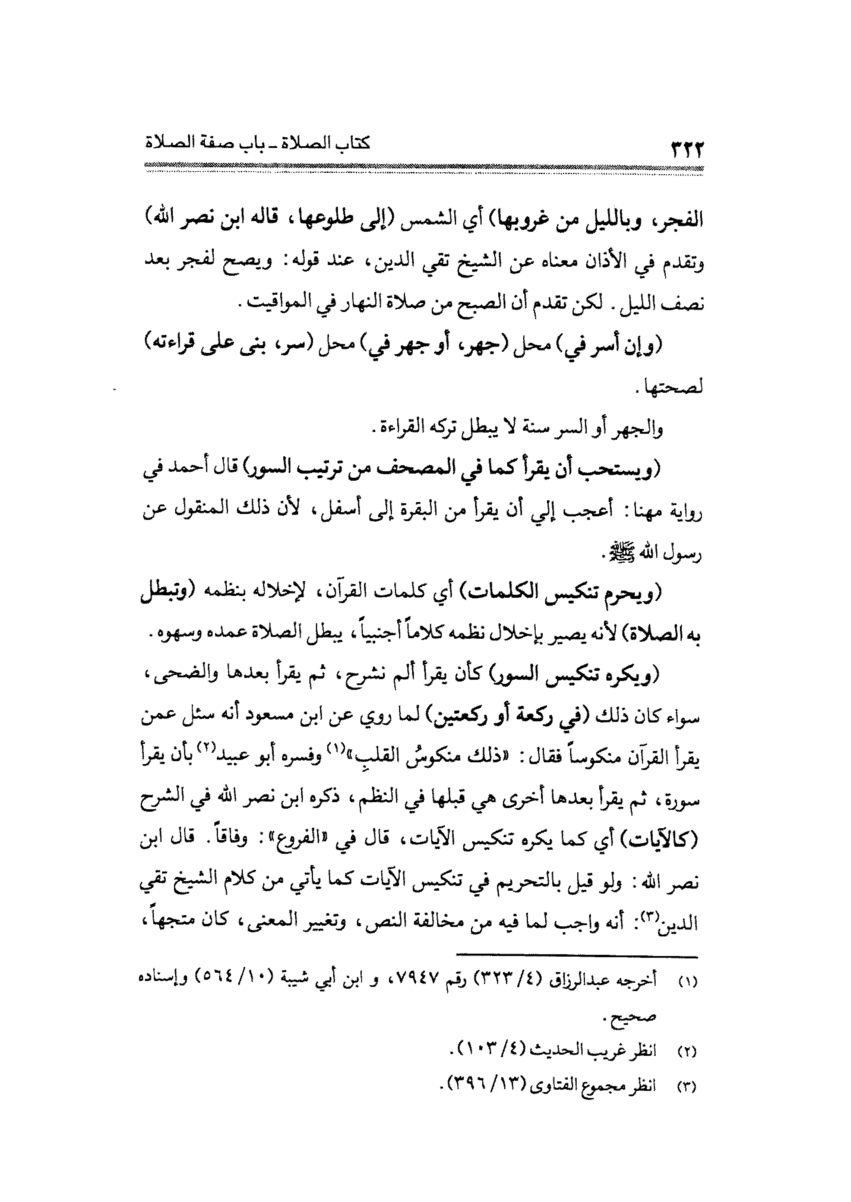 (ويحرم تنكيس الكلمات) أي كلمات القرآن، لإخلاله بنظمه (وتبطل به الصلاة) لأنه يصير بإخلال نظمه كلامًا أجنبيًا، يبطل الصلاة عمده وسهوه.