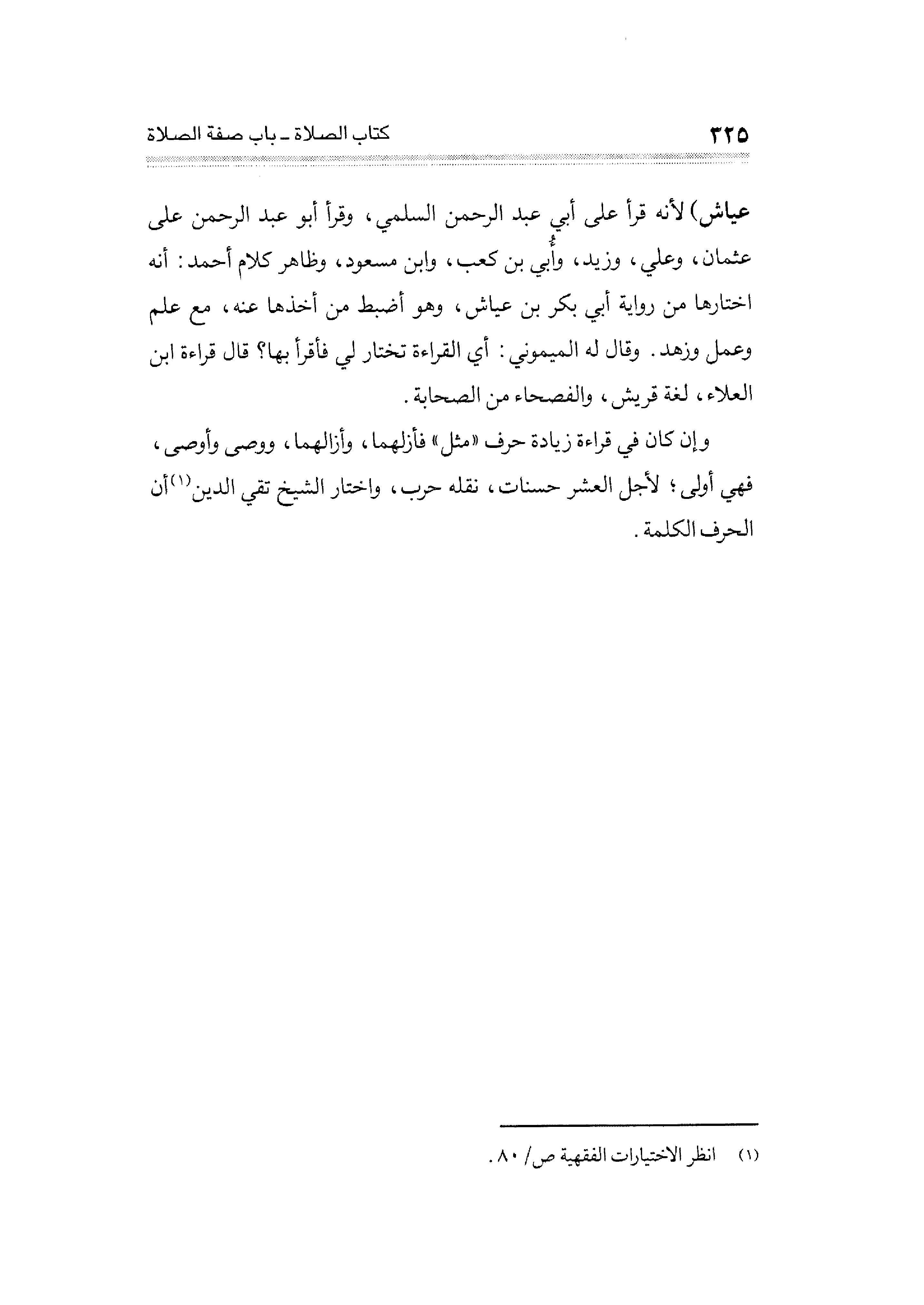 عياش) لأنه قرأ على أبي عبد الرحمن السلمي، وقرأ أبو عبد الرحمن على عثمان، وعلى، وزيد، وأُبي بن كعب، وابن مسعود، وظاهر كلام أحمد: أنه اختارها من رواية أبي بكر بن عياش، وهو أضبط من أخذها عنه، مع علم وعمل وزهد. وقال له الميموني: أي القراءة تختار لي فأقرأ بها؟ قال قراءة ابن العلاء، لغة قريش، والفصحاء من الصحابة.