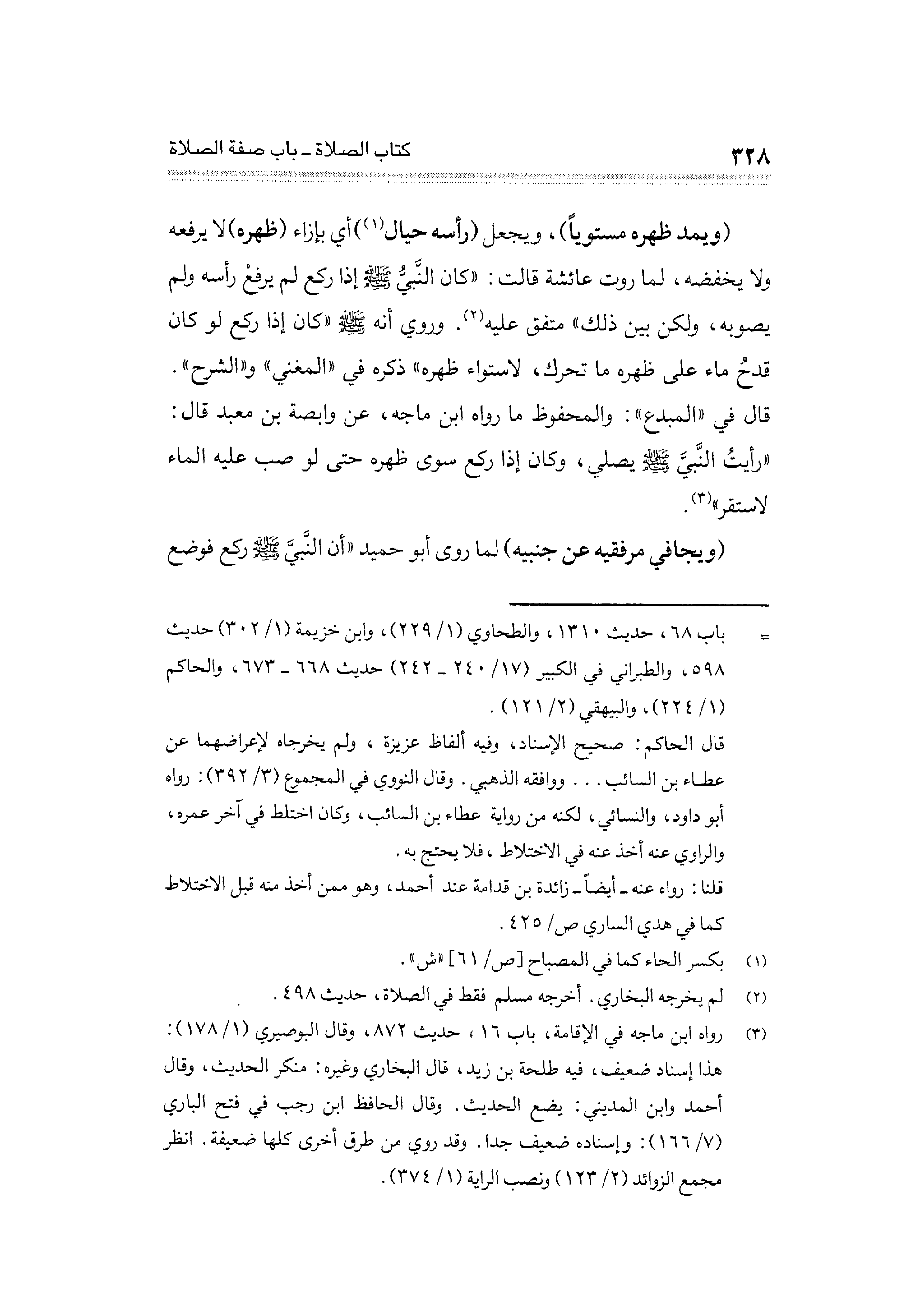 (ويمد ظهر مستويًا)، ويجعل (رأسه حيال (¬١)) أي بإزاء (ظهره) لا يرفعه ولا يخفضه، لما روت عائشة قالت: "كان النَّبيُّ - صلى الله عليه وسلم - إذا ركع لم يرفع رأسه ولم يصوبه، ولكن بين ذلك" متفق عليه (¬٢). وروي أنه - صلى الله عليه وسلم - "كان إذا ركع لو كان قدحُ ماء على ظهره ما تحرك، لإستواء ظهره" ذكره في "المغني" و"الشرح". قال في "المبدع": والمحفوظ ما رواه ابن ماجه، عن وابصة بن معبد قال: "رأيتُ النَّبيَّ - صلى الله عليه وسلم - يصلى، وكان إذا ركع سوى ظهره حتى لو صب عليه الماء لاستقر" (¬٣).