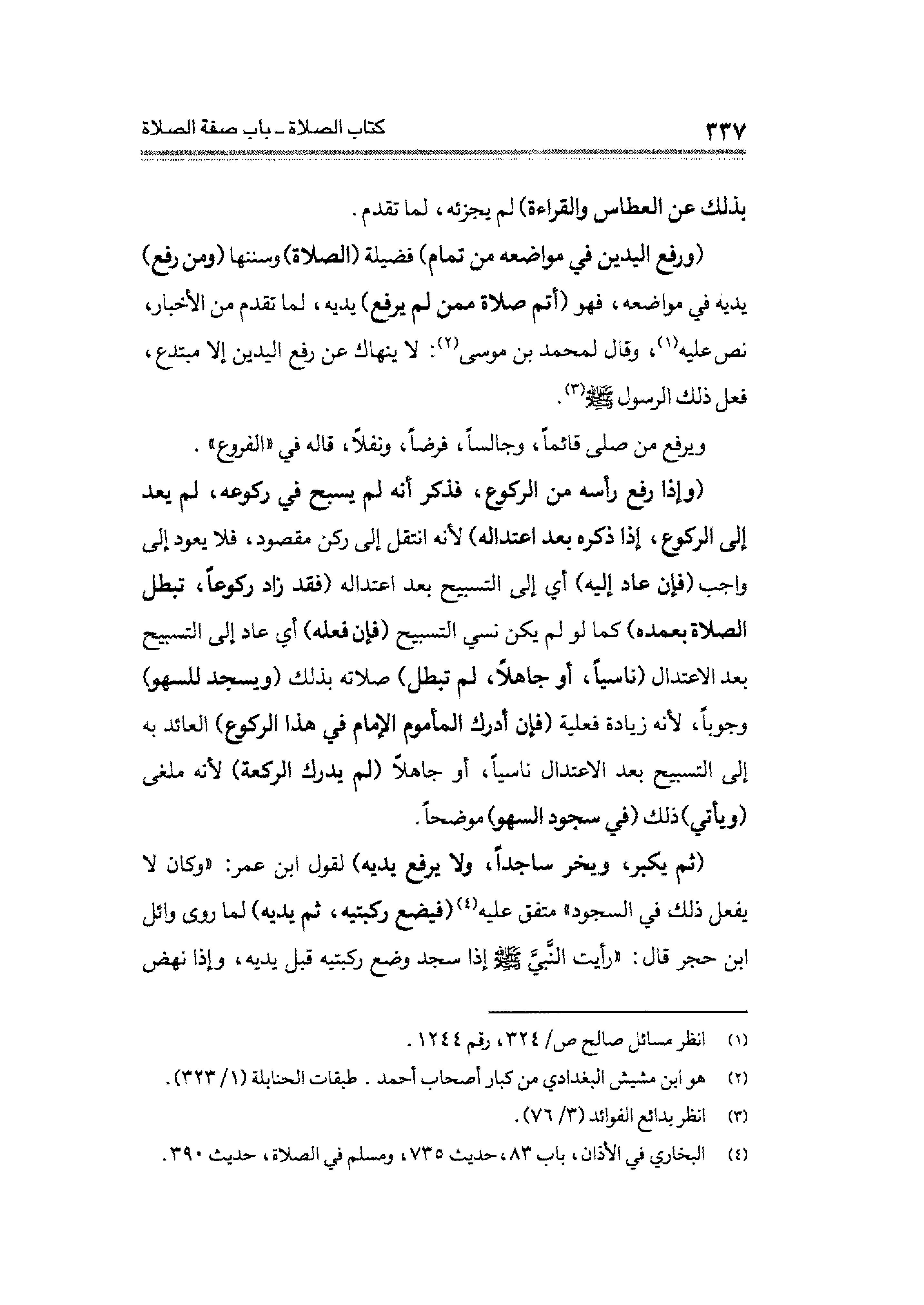 (ورفع اليدين في مواضعه من تمام) فضيلة (الصلاة) وسننها (ومن رفع) يديه في مواضعه، فهو (أتم صلاة ممن لم يرفع) يديه، لما تقدم من الأخبار، نص عليه (¬١)، وقال لمحمد بن موسى (¬٢): لا ينهاك عن رفع اليدين إلا مبتدع، فعل ذلك الرسول (¬٣).