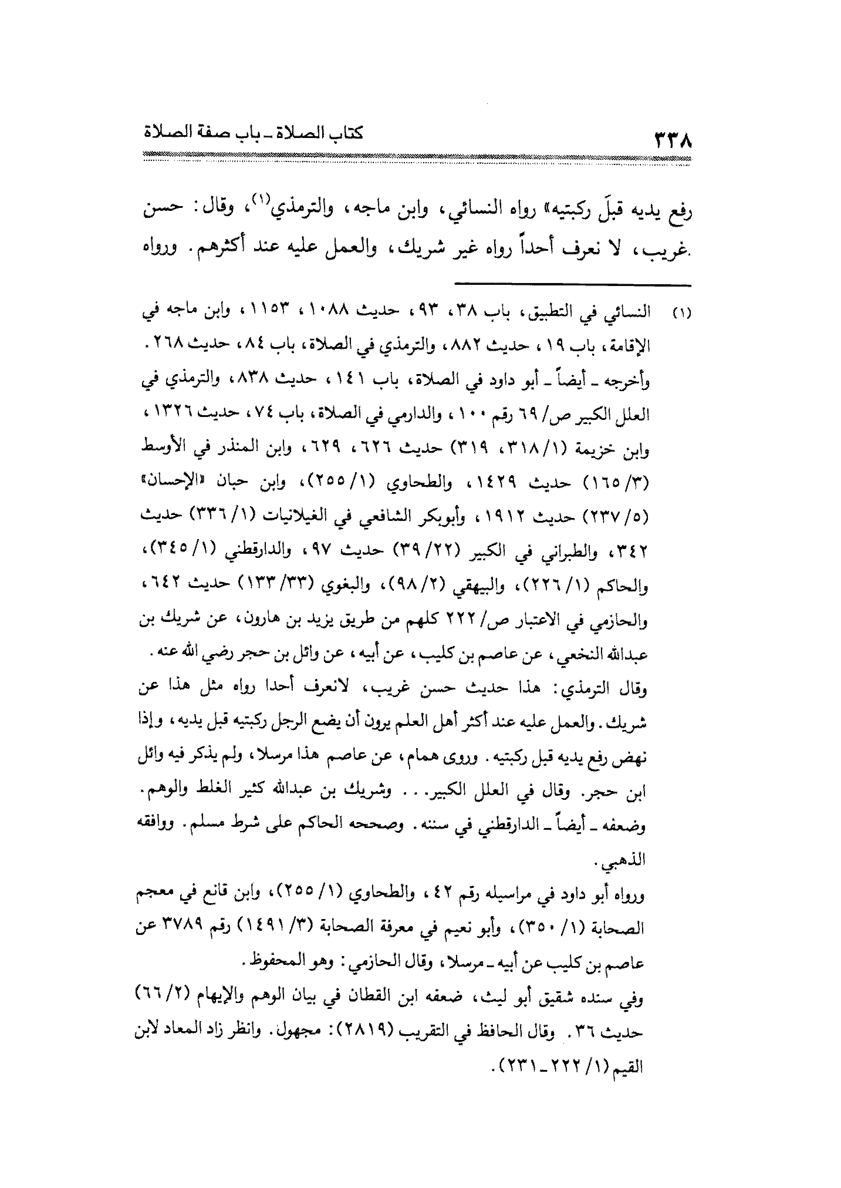(¬١) النسائي في التطبيق، باب ٣٨، ٩٣، حديث ١٠٨٨، ١١٥٣، وابن ماجه في الإقامة، باب ١٩، حديث ٨٨٢، والترمذي في الصلاة، باب ٨٤، حديث ٢٦٨. وأخرجه - أيضاً - أبو داود في الصلاة، باب ١٤١، حديث ٨٣٨، والترمذي في العلل الكبير ص/ ٦٩ رقم ١٠٠، والدارمي في الصلاة، باب ٧٤، حديث ١٣٢٦، وابن خزيمة (١/ ٣١٨، ٣١٩) حديث ٦٢٦، ٦٢٩، وابن المنذر في الأوسط (٣/ ١٦٥) حديث ١٤٣٩، والطحاوي (١/ ٢٥٥)، وابن حبان "الإحسان" (٥/ ٢٣٧) حديث ١٩١٢، وأبو بكر الشافعي في الغيلانيات (١/ ٣٣٦) حديث ٣٤٢، والطبراني في الكبير (٣٩/ ٢٢) حديث ٩٧، والدارقطني (١/ ٣٤٥)، والحاكم (١/ ٢٢٦)، والبيهقي (٢/ ٩٨)، والبغوي (٣٣/ ١٣٣) حديث ٦٤٣، والحازمي في الاعتبار ص/ ٢٢٢ كلهم من طريق يزيد بن هارون، عن شريك بن عبد الله النخعي، عن عاصم بن كليب، عن أبيه، عن وائل بن حجر رضي الله عنه. وقال الترمذي: هذا حديث حسن غريب، لا نعرف أحدا رواه مثل هذا عن شريك. والعمل عليه أكثر أهل العلم يرون أن يضع الرجل ركبتيه في يديه، وإذا نهض رفع يديه في ركبتيه. وروى همام، عن عاصم هذا مرسلا، ولم يذكر في وائل ابن حجر. وقال في العلل الكبير. . . وشريك بن عبد الله كثير الغلط والوهم - وضعفه - أيضاً - الدارقطني في سننه. وصححه الحاكم على شرط مسلم. ووافقه الذهبي.
