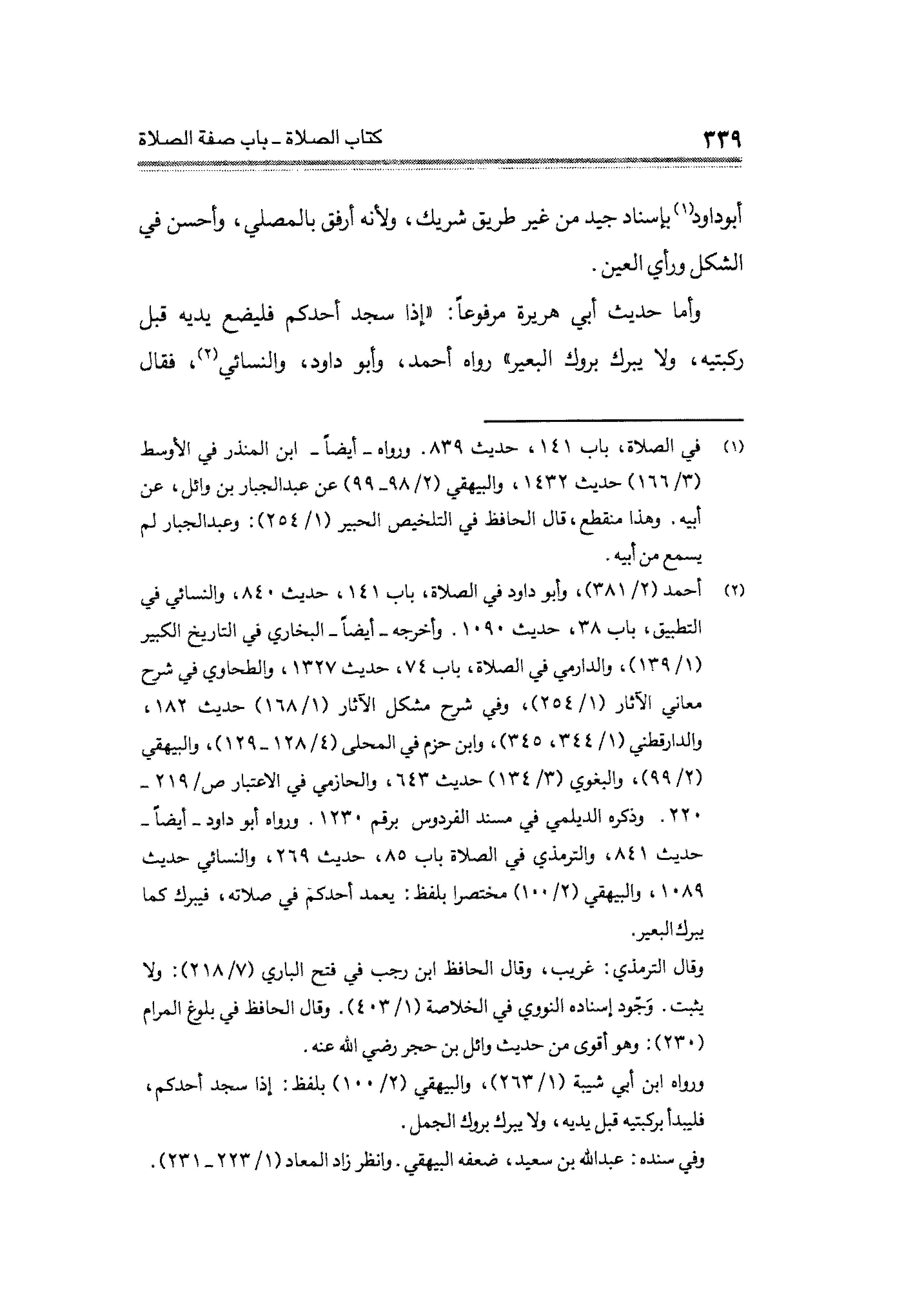 (¬٢) أحمد (٢/ ٣٨١)، وأبو داود في الصلاة، باب ١٤١، حديث ٨٤٠، والنسائى في التطبيق، باب ٣٨، حديث ١٠٩٠. وأخرجه - أيضاً - البخارى في التاريخ الكبير (١/ ١٣٩)، والدارمى فى الصلاة، باب ٧٤، حديث ١٣٢٧، والطحاوي في شرح معاني الآثار (١/ ٢٥٤)، وفي شرح مشكل الآثار (١/ ١٦٨) حديث ١٨٢، والدارقطني (١/ ٣٤٤، ٣٤٥)، وابن حزم في المحلى (٤/ ١٢٨ - ١٢٩)، والبيهقي (٢/ ٩٩)، والبغوي (٣/ ١٣٤) حديث ٦٤٣، والحازمي في الاعتبار ص / ٢١٩ - ٢٣٠. وكره الديلمي في مسند الفردوس برقم ١٢٣٠. ورواه أبو داود - أيضاً - حديث ٨٤١، والترمذي في الصلاة باب ٨٥، حديث ٢٦٩، والنسائي حديث ١٠٨٩، والبيهقي (٢/ ١٠٠) مختصرًا بلفظ: يعمد أحدكم في صلاته، فيبرك كما تبرك البعير.