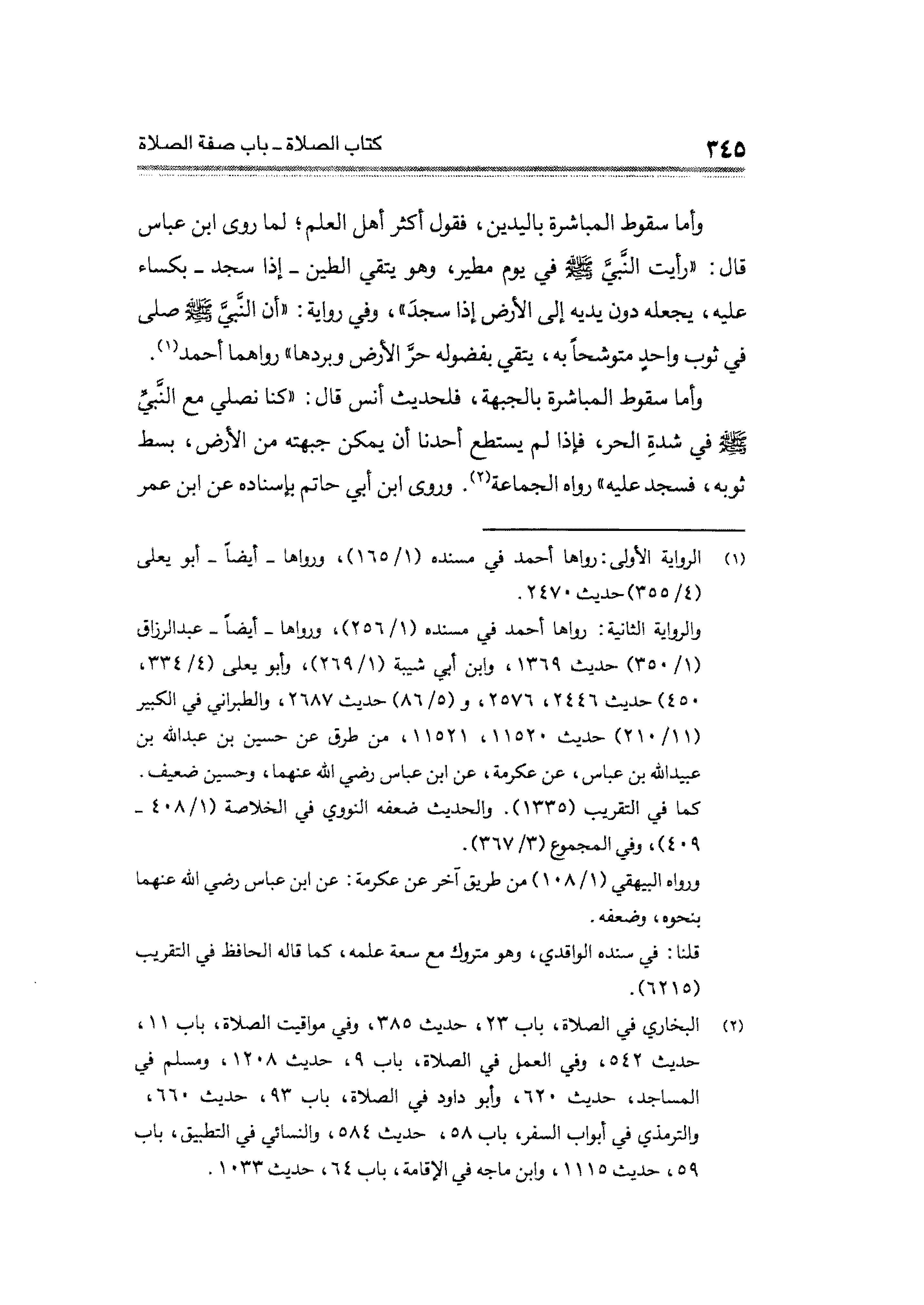 وأما سقوط المباشرة باليدين، فقول أكثر أهل العلم، لما روى ابن عباس قال: "رأيت النَّبي - صلى الله عليه وسلم - في يوم مطير، وهو يتقي الطين - إذا سجد - بكساء عليه، يجعله دون يديه إلى الأرض إذا سجدَ"، وفي رواية: "أن النبى - صلى الله عليه وسلم - صلى في ثوب واحد متوشحاً به، يتقى بفضوله حرَّ الأرض وبردها" رواهما أحمد (¬١).