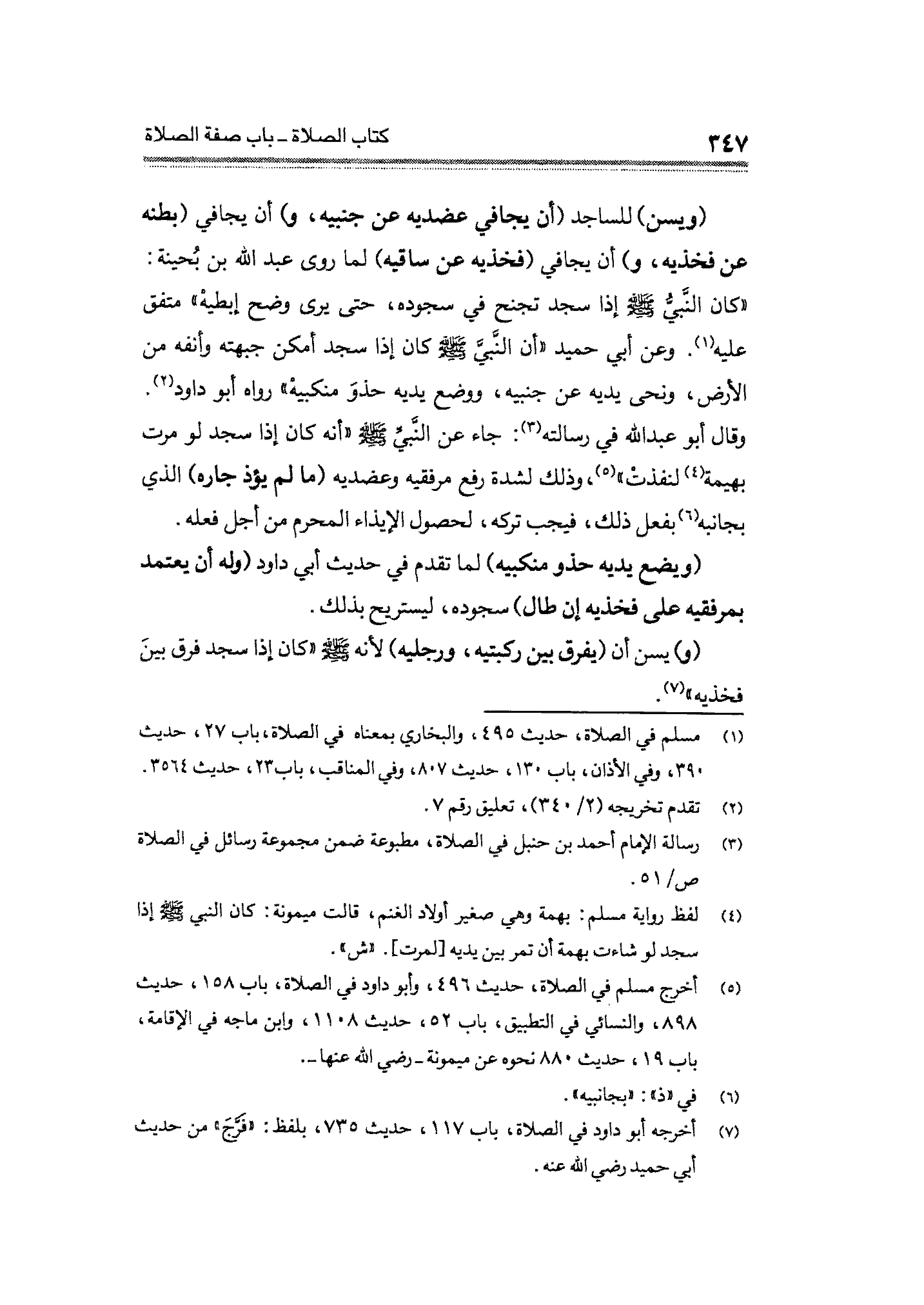 (ويسن) للساجد (أن يجافي عضديه عن جنبيه، و) أن يجافي (بطنه عن فخذيه، و) أن يجافى (فخذيه عن ساقه) لما روى عبد الله بن بُحينة: "كان النبى - صلى الله عليه وسلم - إذا سجد تجنح في سجوده، حتى يرى وضح إبطيه" متفق عليه (¬١). وعن أبى حميد "أن النبى - صلى الله عليه وسلم - كان إذا سجد أمكن جبهته وأنفه من الأرض، ونحى يديه عن جنبيه، ووضع يديه حذوَ منكبيه" رواه أبو داود (¬٢)، وقال أبو عبد الله فى رسالته (¬٣): جاء عن النبى - صلى الله عليه وسلم - كان إذا سجد لو مرت بهيمة (¬٤)، لنفذتْ" (¬٥)، وذلك لشدة رفع مرفقيه وعضديه (ما لم يؤذ جاره) الذي بجانبه (¬٦) بفعل ذلك، فيجب تركه، لحصول الإيذاء المحرم من أجل فعله.
