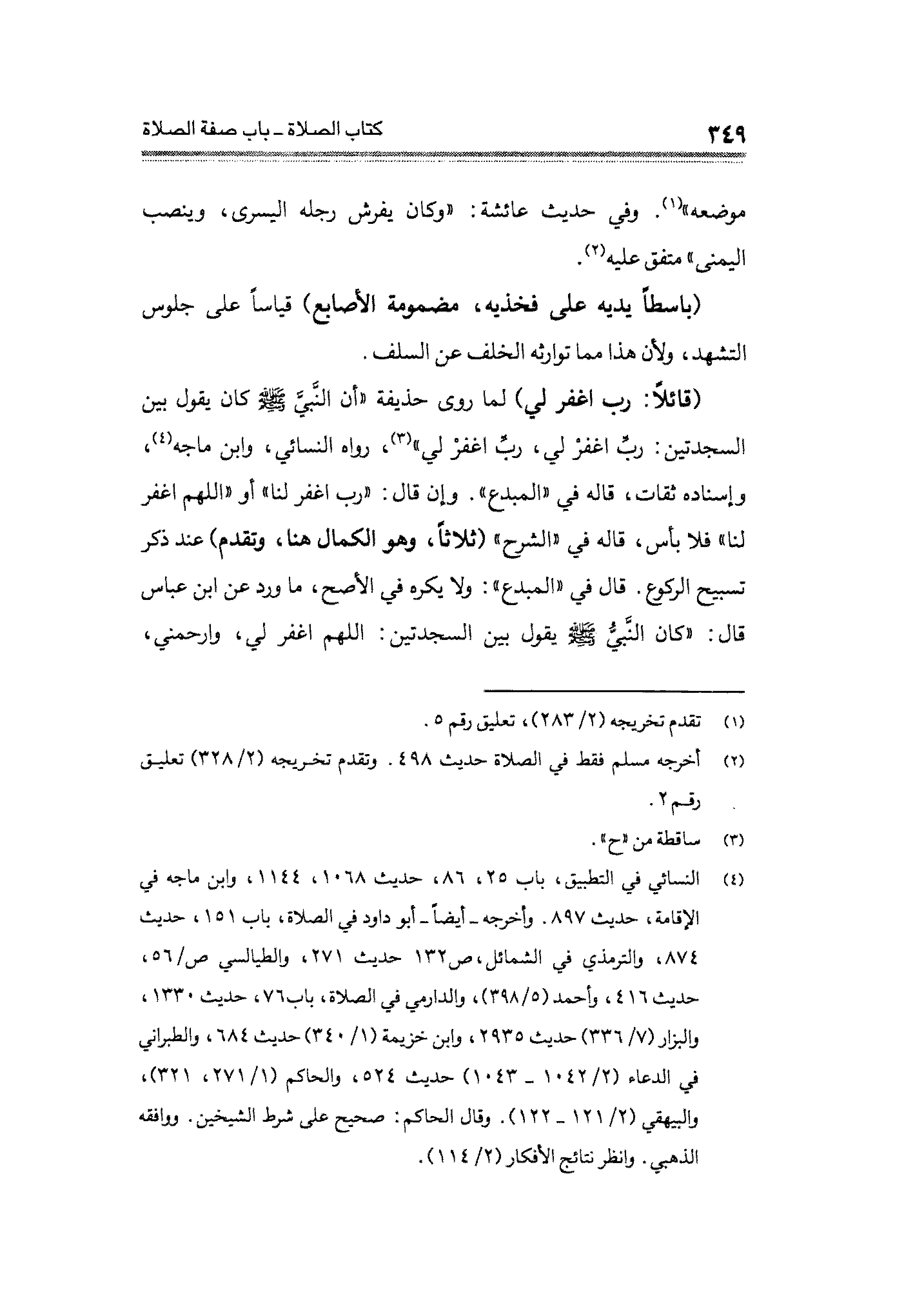 (قائلًا: رب اغفر لي) لما روى حذيفة "أن النَّبيَّ - صلى الله عليه وسلم - كان يقول بين السجدتين: ربِّ اغفرْ لي، ربِّ اغفرْ لي"، (¬٣)، رواه النسائي، وابن ماجه (¬٤)، وإسناده ثقات، قاله في "المبدع". وإن قال: "رب اغفر لنا" أو "اللهم اغفر لنا" فلا بأس، قاله في "الشرح" (ثلاثًا، وهو الكمال هنا، وتقدم) عند ذكر تسبيح الركوع. قال في "المبدع": ولا يكره في الأصح، ما ورد عن ابن عباس قال: "كان النَّبيُّ - صلى الله عليه وسلم - يقول بين السجدتين: اللهم اغفر لي، وارحمني،