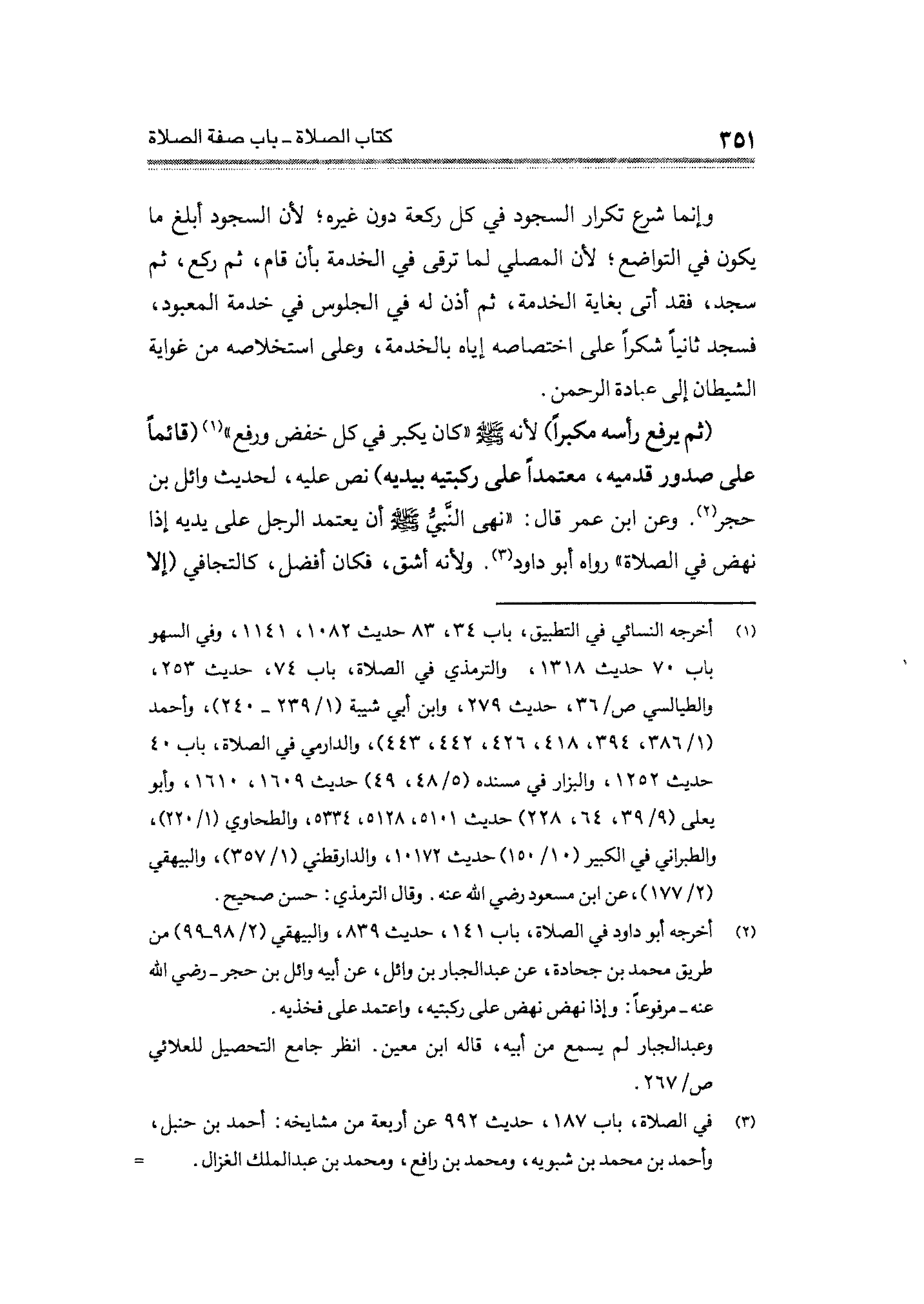 (¬٢) أخرجه أبو داود في الصلاة، باب ١٤١، حديث ٨٣٩، والبيهقي (٢/ ٩٨ - ٩٩) من طريق محمد بن جحادة، عن عبد الجبار بن وائل، عن أبيه وائل بن حجر - رضي الله عنه - مرفوعًا: وإذا نهض نهض على ركبتيه، واعتمد على فخذيه.