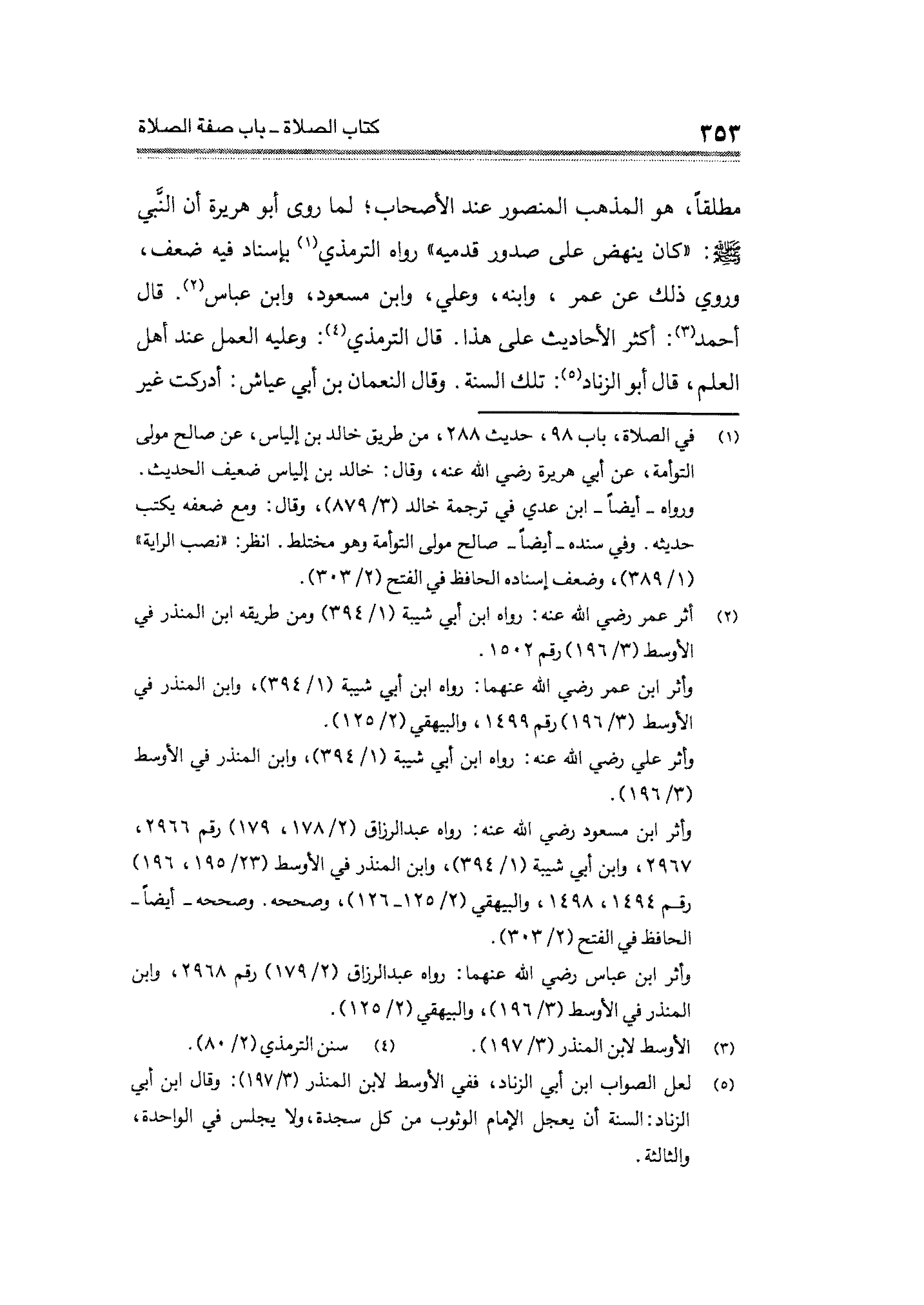 (¬٥) لعل الصواب ابن أبي الزناد، ففي الأوسط لابن المنذر (٣/ ١٩٧): وقال بن أبي الزناد: السنة أن يعجل الإمام الوثوب من كل سجدة، ولا يجلس في الواحدة، والثالثة.