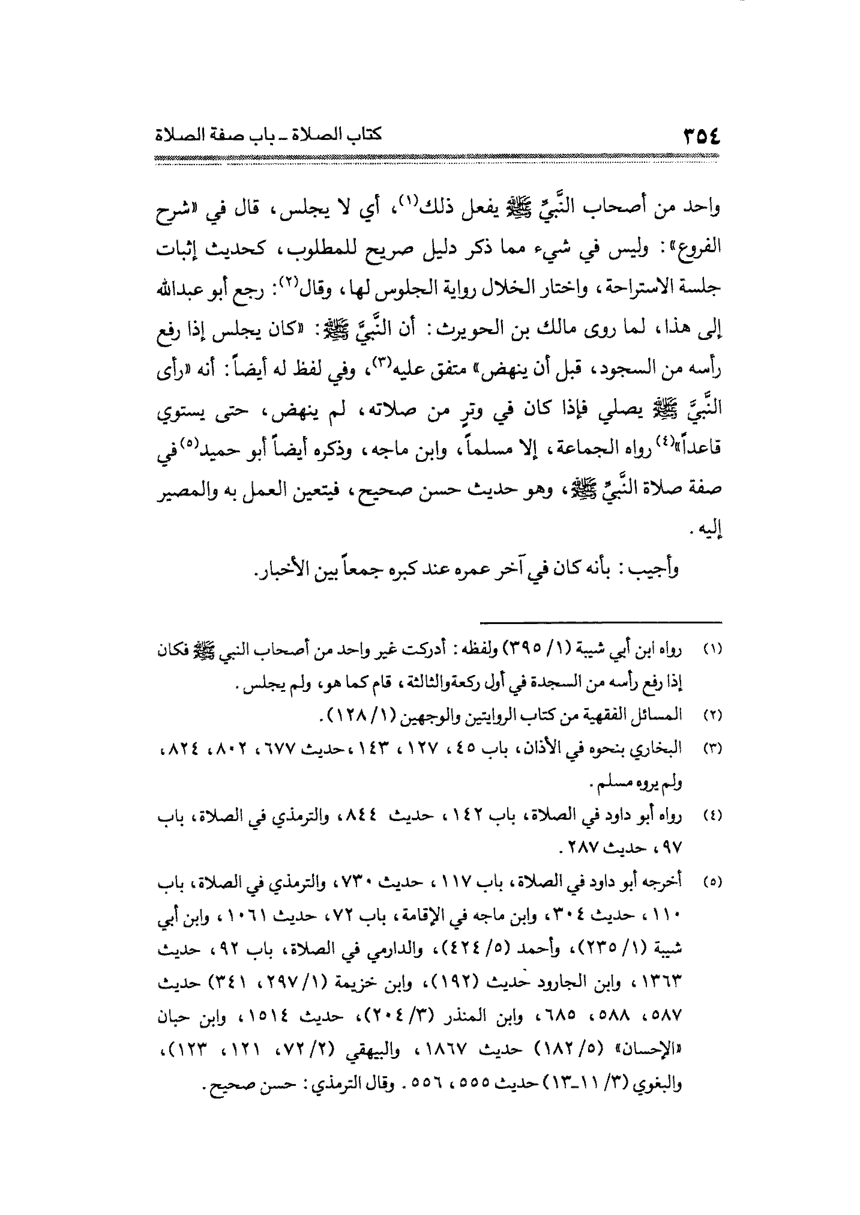 واحد من أصحاب النَّبيِّ - صلى الله عليه وسلم - يفعل ذلك (¬١)، أي لا يجلس، قال في "شرح الفروع": وليس في شيء مما ذكر دليل صريح للمطلوب، كحديث إثبات جلسة الاستراحة، واختار الخلال رواية الجلوس لها، وقال (¬٢): رجع أبو عبد الله إلى هذا، لما روى مالك بن الحويرث: أن النَّبيَّ - صلى الله عليه وسلم -: "كان يجلس إذا رفع رأسه من السجود، قبل أن ينهض" متفق عليه (¬٣)، وفي لفظ له أيضًا: أنه "رأى النَّبيَّ - صلى الله عليه وسلم - يصلي فإذا كان في وترٍ من صلاته، لم ينهض، حتى يستوي فاعدًا" (¬٤) رواه الجماعة، إلا مسلمًا، وابن ماجه، وذكره أيضًا أبو حميد (¬٥) فى صفة صلاة النَّبيِّ - صلى الله عليه وسلم -، وهو حديث حسن صحيح، فيتعين العمل به والمصير إليه.