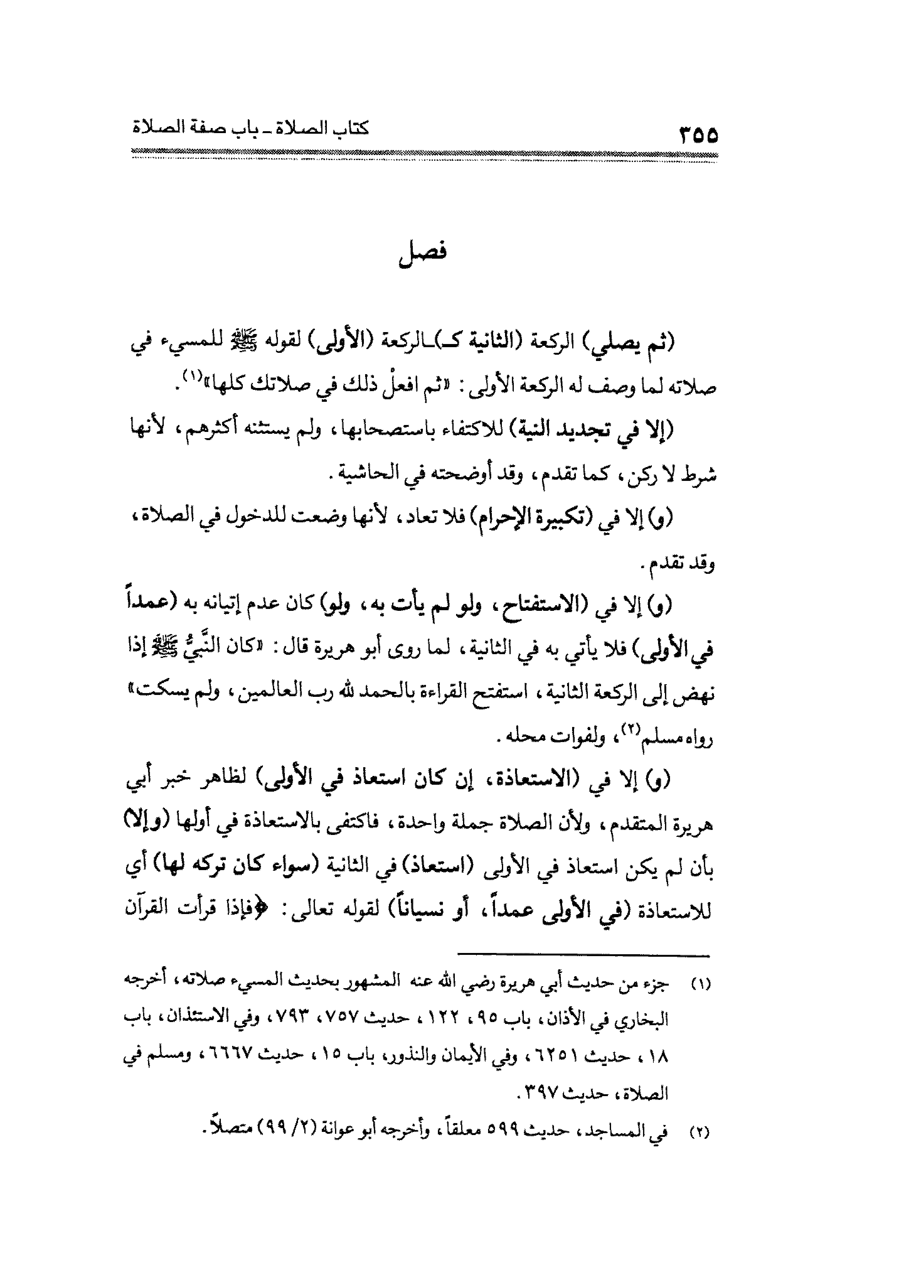 (و) إلا في (الاستعاذة، إن كان استعاذ في الأولى) لظاهر خبر أبي هريرة المتقدم، ولأن الصلاة جملة واحدة، فاكتفى بالاستعاذة في أولها (وإلا) بأن لم يكن استعاذ في الأولى (استعاذ) في الثانية (سواء كان تركه لها) أي للاستعاذة (في الأولى عمدًا، أو نسيانًا) لقوله تعالى: {فَإِذَا قَرَأْتَ الْقُرْآنَ