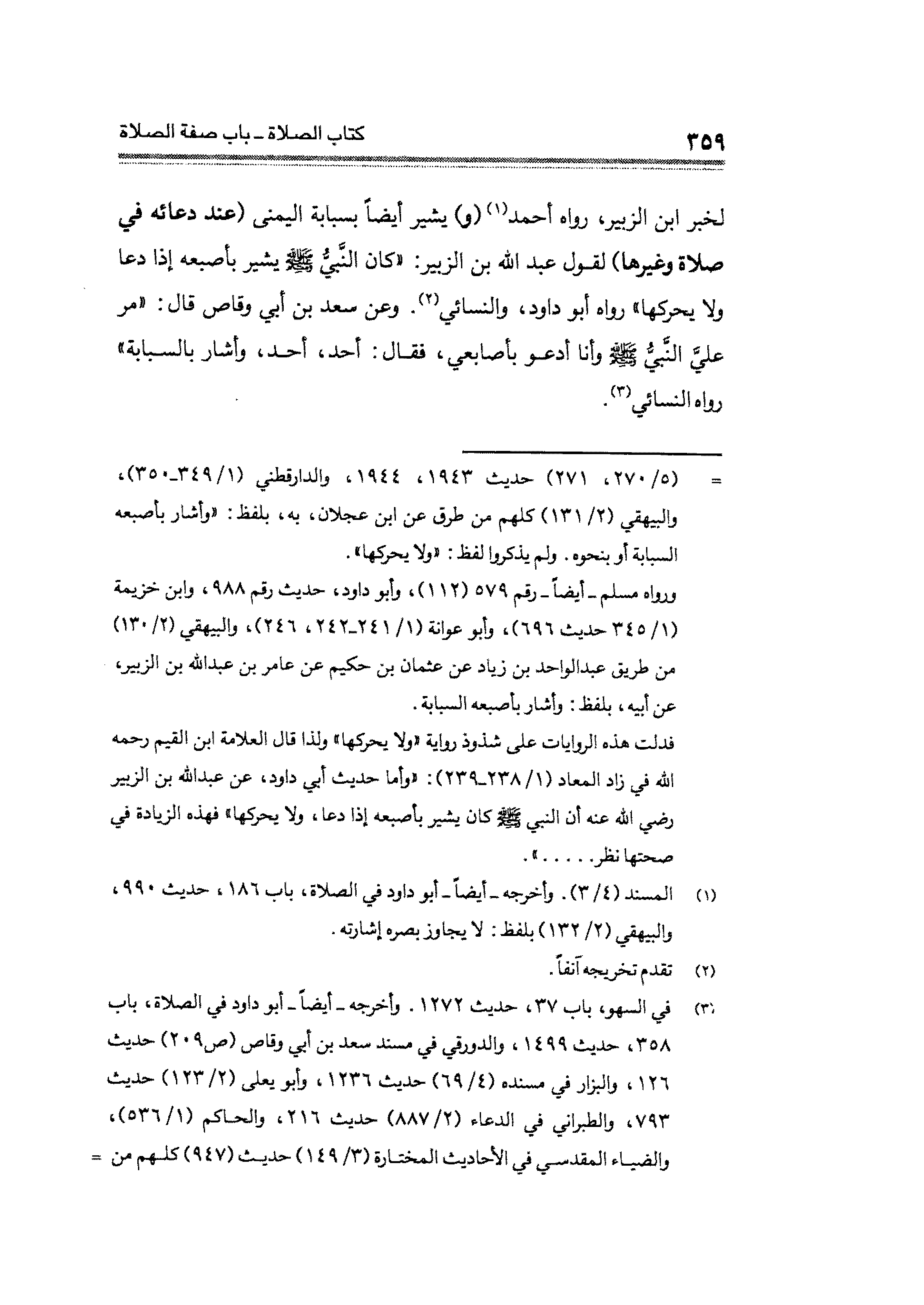 فدلت هذه الروايات على شذوذ رواية "ولا يحركها" ولذا قال العلامة ابن القيم رحمه الله في زاد المعاد (١/ ٢٣٨ - ٢٣٩): "وأما حديث أبي داود، عن عبد الله بن الزبير رضي الله عنه أن النبي - صلى الله عليه وسلم - كان يشير بأصبعه إذا دعا، ولا يحركها" فهذه الزيادة في صحتها نظر. . . . ".