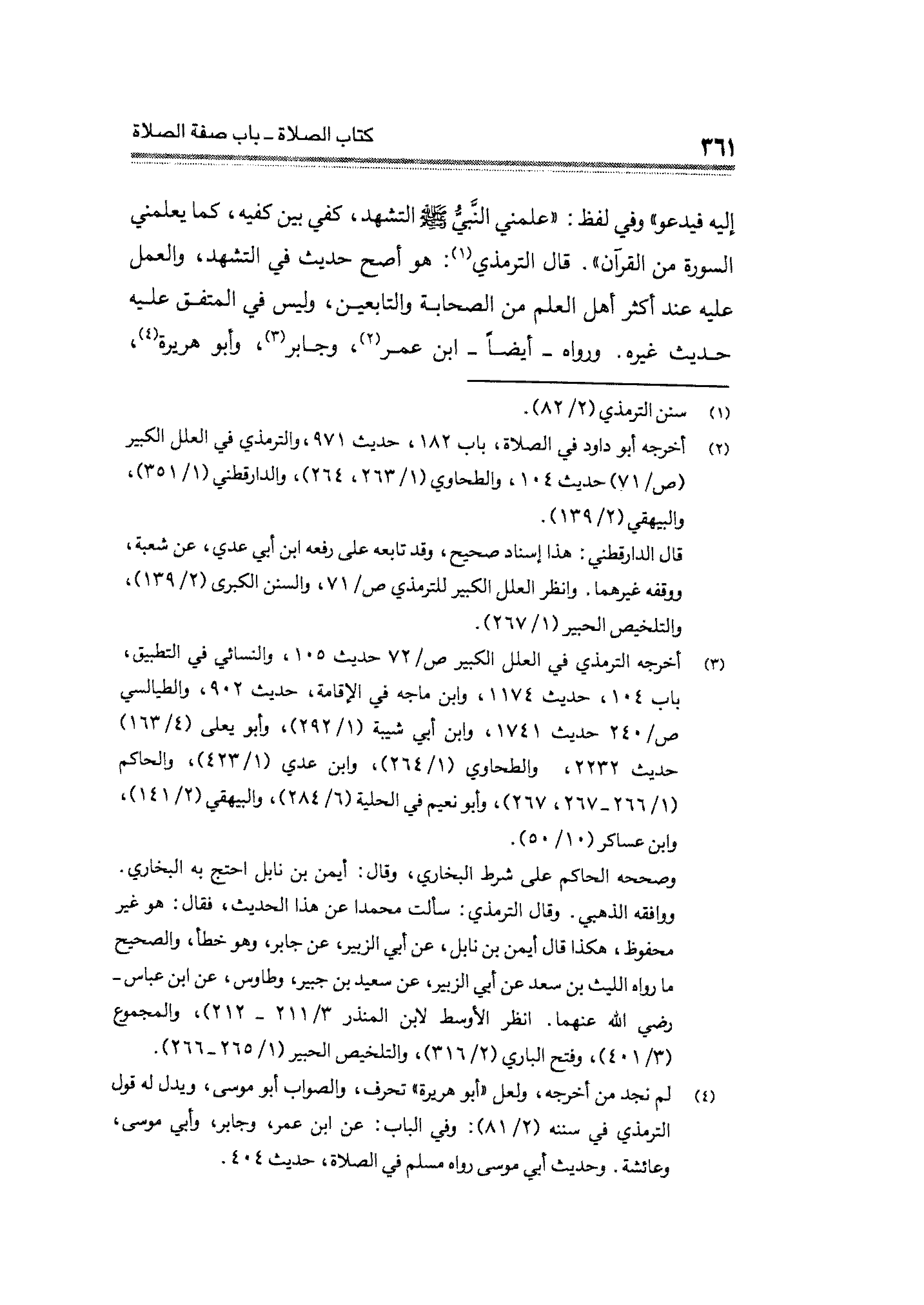 (¬٣) أخرجه الترمذي في العلل الكبير ص/٧٢ حديث ١٠٥، والنسائي في التطبيق، باب ١٠٤، حديث ١١٧٤، وابن ماجه في الإقامة، حديث ٩٠٢، والطيالسي ص / ٢٤٠ حديث ١٧٤١، وابن أبي شيبة (١/ ٢٩٢)، وأبو يعلى (٤/ ١٦٣) حديث ٢٢٣٢، والطحاوي (١/ ٢٦٤)، وابن عدي (١/ ٤٢٣)، والحاكم (١/ ٢٦٦ - ٢٦٧، ٢٦٧)، وأبو نعيم في الحلية (٦/ ٢٨٤)، والبيهقي (٢/ ١٤١)، وابن عساكر (١٠/ ٥٠).