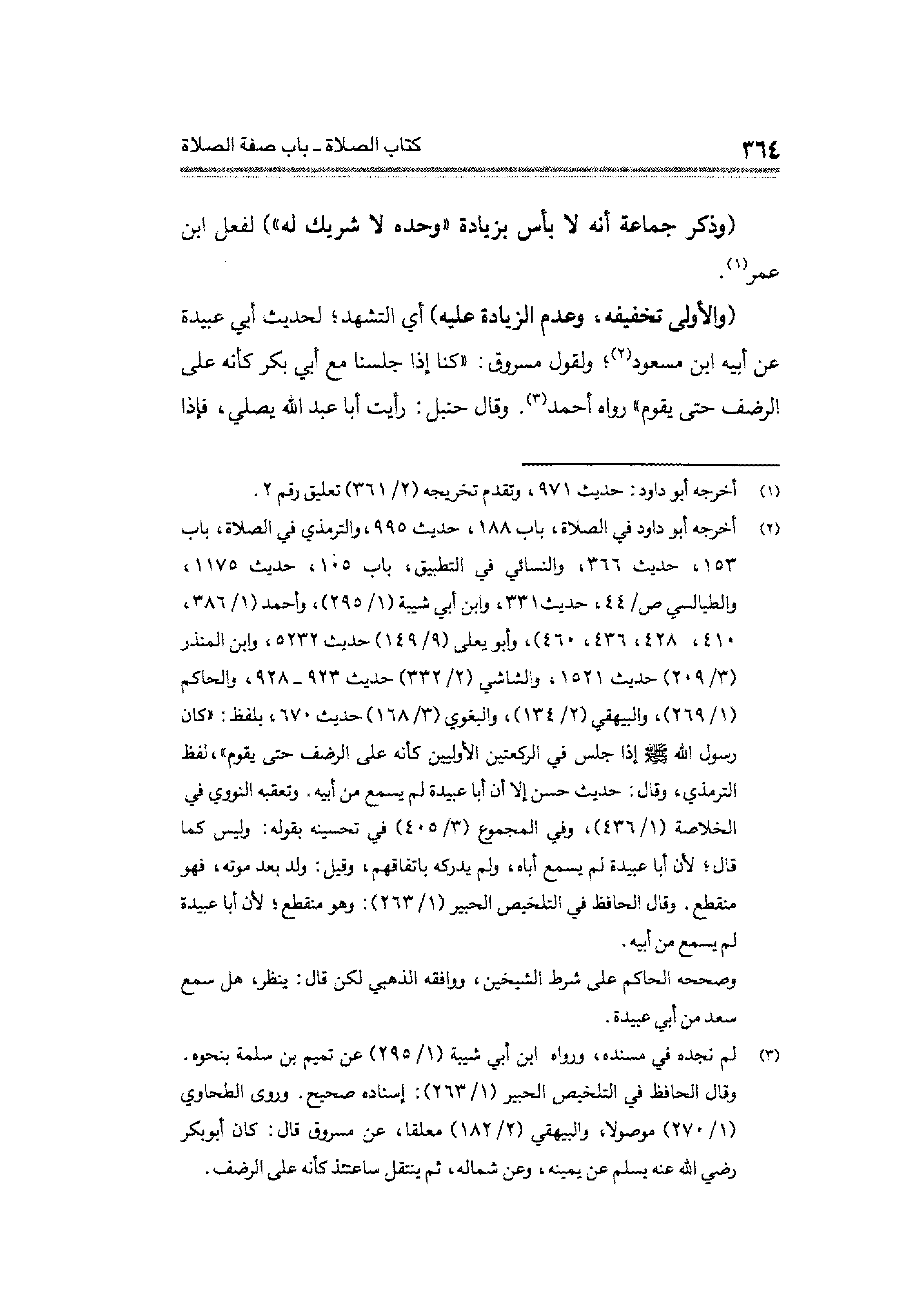 (¬٢) أخرجه أبو داود في الصلاة، باب ١٨٨، حديث ٩٩٥، والترمذي في الصلاة، باب ١٥٣، حديث ٣٦٦، والنسائي في التطبيق، باب ١٠٥، حديث ١١٧٥، والطيالسي ص/ ٤٤، حديث ٣٣١، وإبن أبي شيبة (١/ ٢٩٥)، وأحمد (١/ ٣٨٦، ٤١٠، ٤٢٨، ٤٣٦، ٤٦٠)، وأبو يعلى (٩/ ١٤٩) حديث ٥٢٣٢، وابن المنذر (٣/ ٢٠٩) حديث ١٥٢١، والشاشي (٢/ ٣٣٢) حديث ٩٢٣ - ٩٢٨، والحاكم (١/ ٢٦٩)، والبيهقي (٢/ ١٣٤)، والبغوي (٣/ ١٦٨) حديث ٦٧٠، بلفظ: "كان رسول الله - صلى الله عليه وسلم - إذا جلس في الركعتين الأوليين كأنه على الرضف حتى يقوم"، لفظ الترمذي، وقال: حديث حسن إلا أن أبا عبيدة لم يسمع من أبيه. وتعقبه النووي في الخلاصة (١/ ٤٣٦)، في المجموع (٣/ ٤٠٥) في تحسينه بقوله: وليس كما قال؛ لأن أبا عبيدة لم يسمع أباه، ولم يدركه باتفاقهم، وقيل: ولد بعد موته، فهو منقطع. وقال الحافظ في التلخيص الحبير (١/ ٢٦٣): وهو منقطع؛ لأن أبا عبيدة لم يسمع من أبيه.