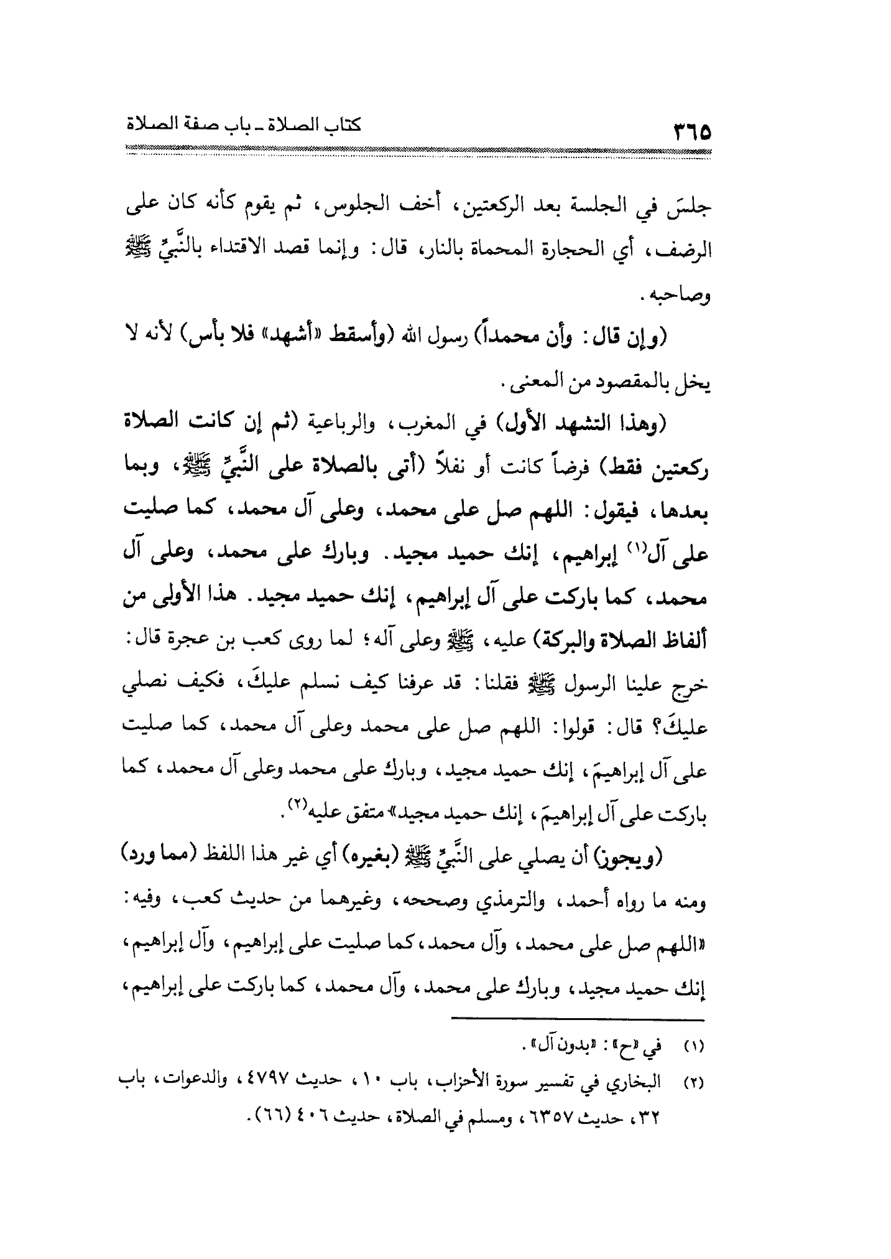 (وهذا التشهد الأول) في المغرب، والرباعية (ثم إن كانت الصلاة ركعتين فقط) فرضًا كانت أو نفلًا (أتى بالصلاة على النَّبيِّ - صلى الله عليه وسلم -، وبما بعدها، فيقول: اللهم صل على محمد، وعلى آل محمد، كما صليت على آل (¬١) إبراهيم، إنك حميد مجيد. وبارك على محمد، وعلى آل محمد، كما باركت على آل إبراهيم، إنك حميد مجيد. هذا الأولى من ألفاظ الصلاة والبركة) عليه، - صلى الله عليه وسلم - وعلى آله؛ لما روى كعب بن عجرة قال: خرج علينا الرسول - صلى الله عليه وسلم - فقلنا: قد عرفنا كيف نسلم عليكَ، فكيف نصلي عليكَ؟ قال: قولوا: اللهم صل على محمد وعلى آل محمد، كما صليت على آل إبراهيمَ، إنك حميد مجيد، وبارك على محمد وعلى آل محمد، كما باركت على آل إبراهيمَ، إنك حميد مجيد" متفق عليه (¬٢).