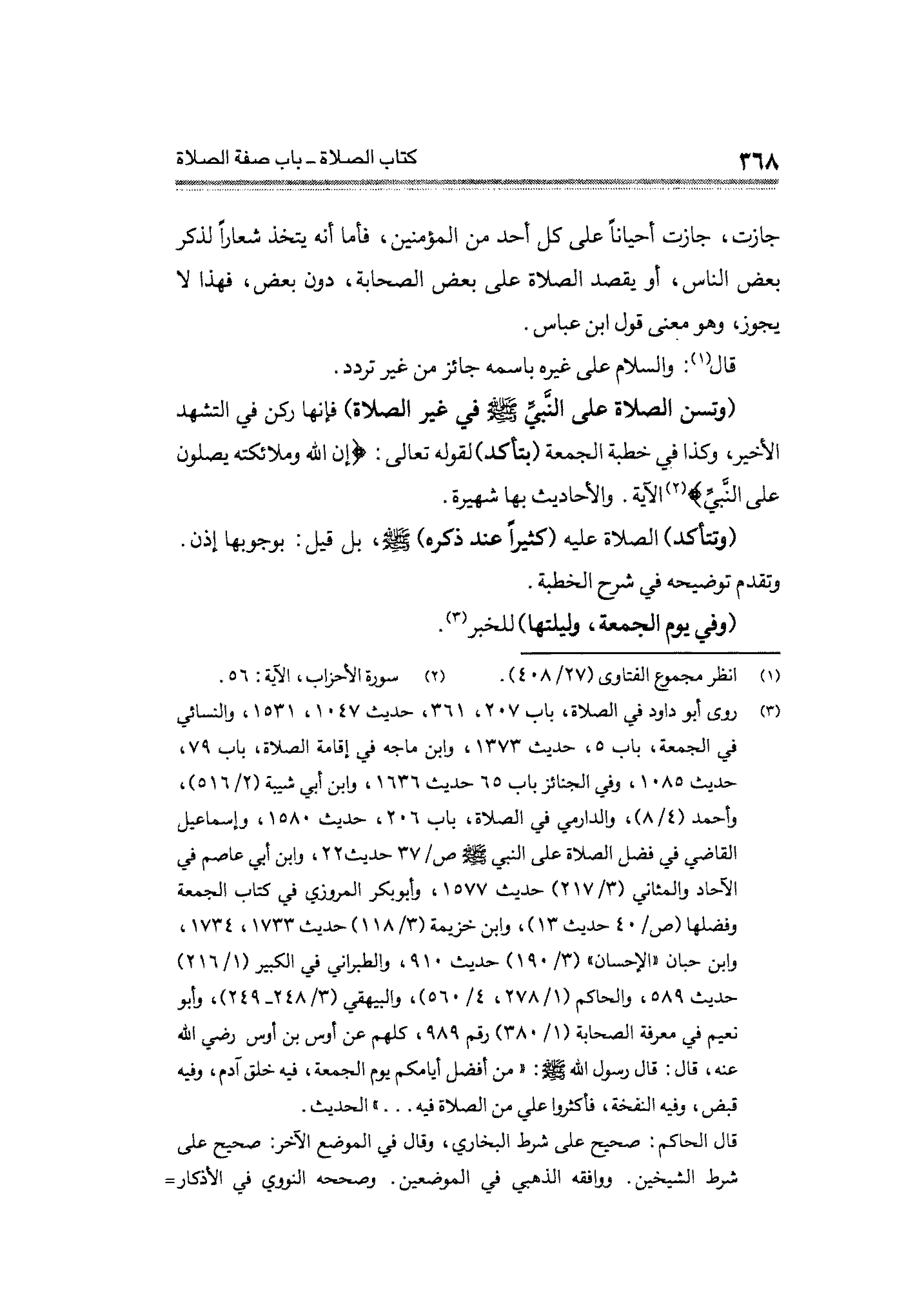 (¬٣) روى أبو داود في الصلاة، باب ٢٠٧، ٣٦١، حديث ١٥٣١،١٠٤٧، والنسائي فى الجمعة، باب ٥، حديث ١٣٧٣، وابن ماجه في إقامة الصلاة، باب ٧٩، حديث ١٠٨٥، وفي الجنائز باب ٦٥ حديث ١٦٣٦، وابن أبي شيبة (٢/ ٥١٦)، وأحمد، (٤/ ٨)، والدارمي في الصلاة، باب ٢٠٦، حديث ١٥٨٠، وإسماعيل القاضي في فضل الصلاة على النبي - صلى الله عليه وسلم - ص/٣٧ حديث ٢٢، وابن أبي عاصم في الآحاد والمثاني (٣/ ٢١٧) حديث ١٥٧٧، وأبو بكر المروزي في كتاب الجمعة وفضلها (ص / ٤٠ حديث ١٣)، وابن خزيمة (٣/ ١١٨) حديث ١٧٣٣، ١٧٣٤، وابن حبان "الإحسان" (٣/ ١٩٠) حديث ٩١٠، والطبراني في الكبير (١/ ٢١٦) حديث ٥٨٩، والحاكم (١/ ٢٧٨، ٤/ ٥٦٠)، والبيهقي (٣/ ٢٤٨ - ٢٤٩)، وأبو نعيم في معرفة الصحابة (١/ ٣٨٠) رقم ٩٨٩، كلهم عن أوس بن أوس رضي الله عنه، قال: قال رسول الله - صلى الله عليه وسلم - "من أفضل أيامكم يوم الجمعة، فيه خلق آدم، وفيه قبض، وفيه النفخة، فأكثروا علي من الصلاة في. . ." الحديث.