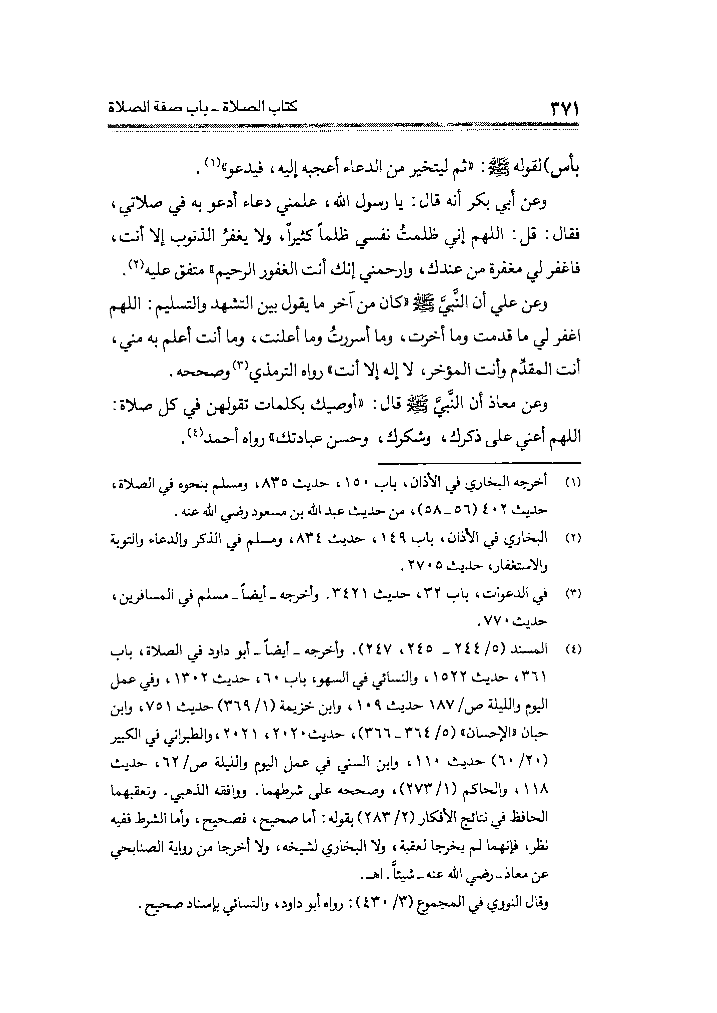 وعن معاذ أن النبيَّ - صلى الله عليه وسلم - قال: "أوصيك بكلمات تقولهن في كل صلاة: اللهم أعني على ذكرك، وشكرك، وحسن عبادتك، رواه أحمد (¬٤).