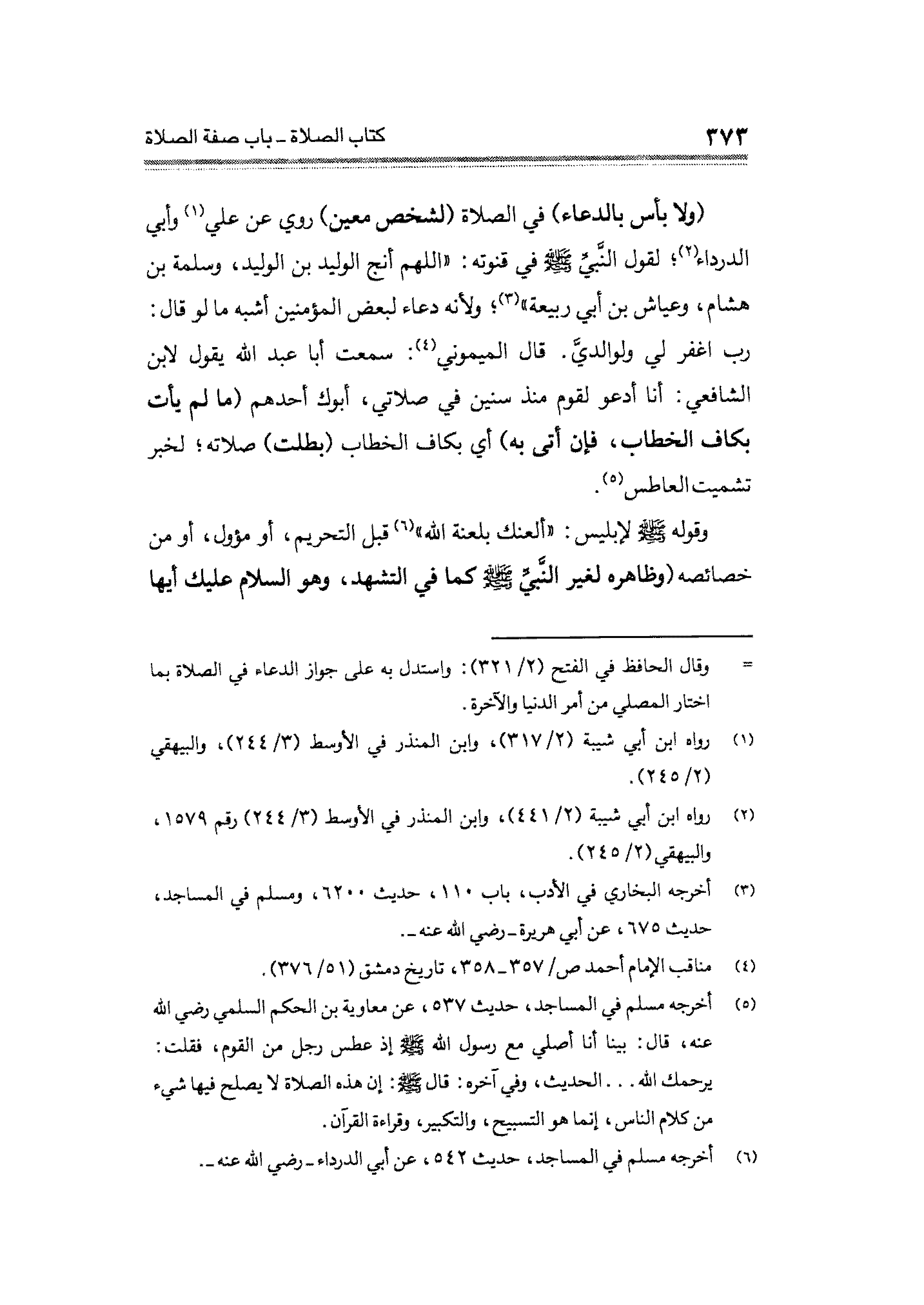 (ولا بأس بالدعاء) في الصلاة (لشخص معين) روي عن علي (¬١) وأبي الدرداء (¬٢)؛ لقول النبيِّ - صلى الله عليه وسلم - في قومه: "اللهم أنج الوليد بن الوليد، وسلمة بن هشام، وعياش بن أبي ربيعة" (¬٣)؛ ولأنه دعاء لبعض المؤمنين أشبه ما لو قال: رب اغفر لي ولوالدي. قال الميموني (¬٤): سمعت أبا عبد الله يقول لابن الشافعي: أنا أدعو لقُوم منذ سنين في صلاتي، أبوك أحدهم (ما لم يأت بكاف الخطاب، فإن أتى به) أي بكاف الخطاب (بطلت) صلاته؛ لخبر تشميت العاطس (¬٥).