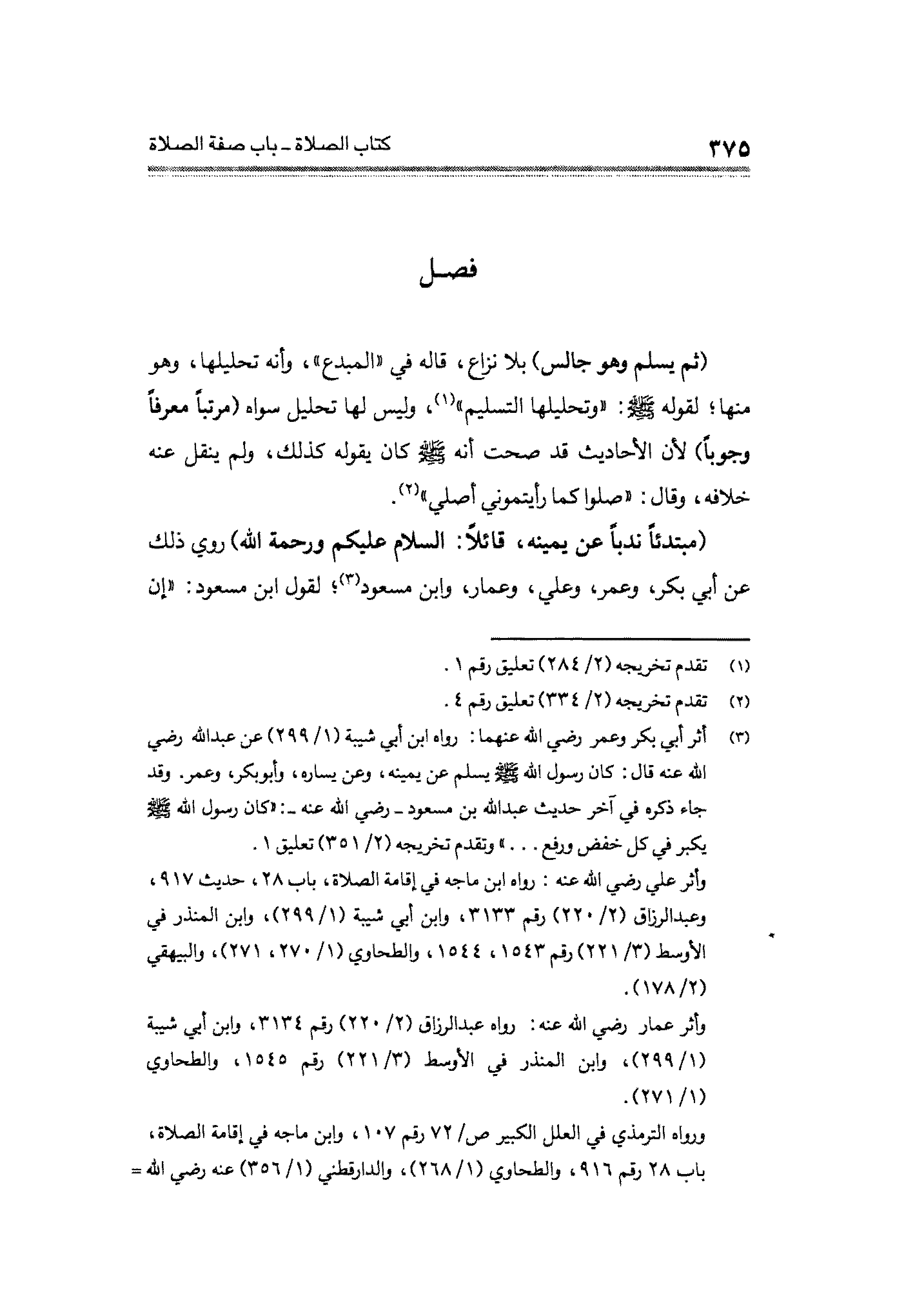 (¬٣) أثر أبي بكر وعمر رضي الله عنهما: رواه ابن أبي شيبة (١/ ٢٩٩) عن عبد الله رضي الله عنه قال: كان رسول الله - صلى الله عليه وسلم - يسلم عن يمينه، وعن يساره، وأبو بكر، وعمر. وقد جاء ذكره في آخر حديث عبد الله بن مسعود - رضي الله عنه -: كان رسول الله - صلى الله عليه وسلم - يكبر في كل خفض ورفع. . . " وتقدم تخريجه (٢/ ٣٥١) تعليق ١.