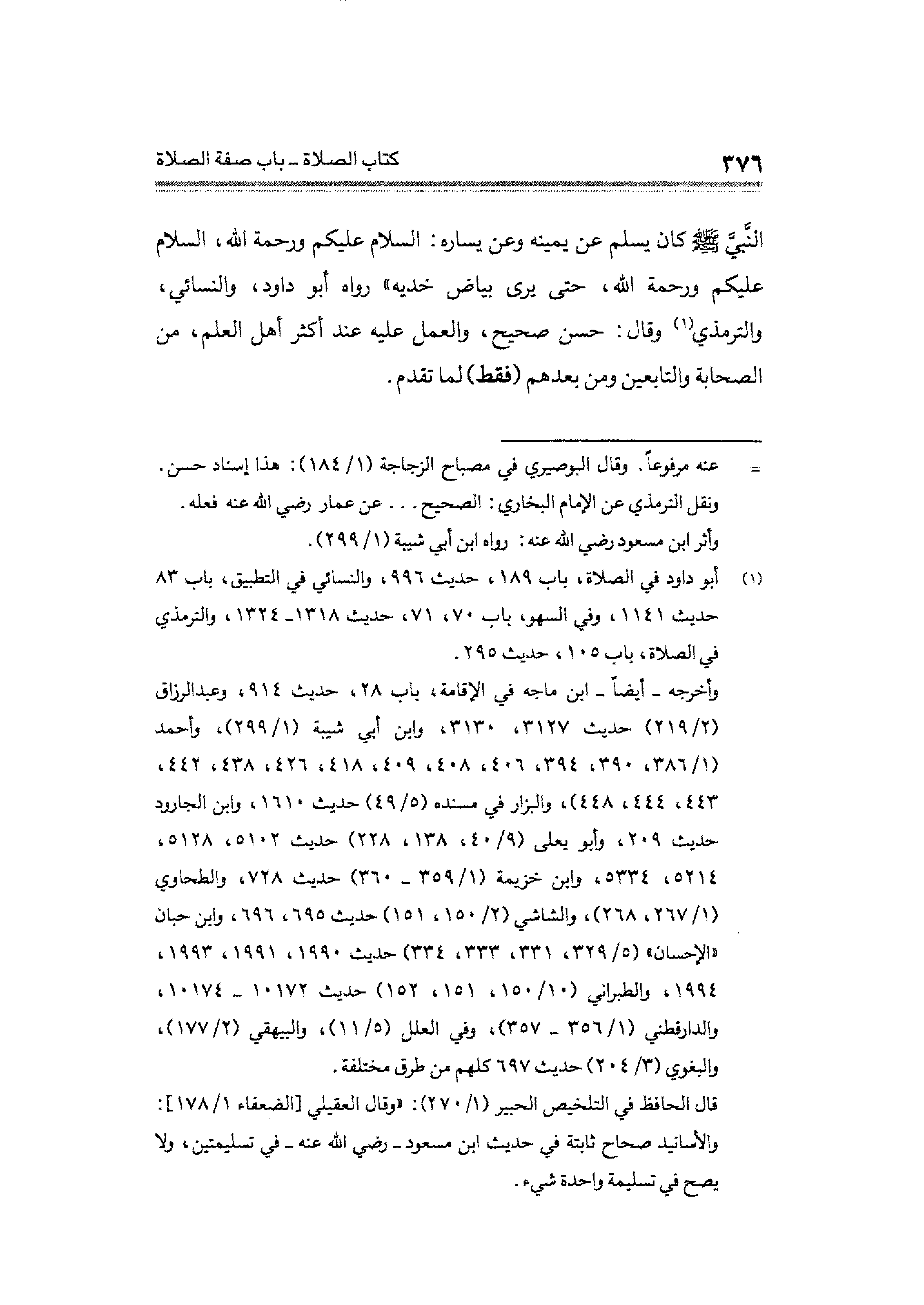 النَّبي - صلى الله عليه وسلم - كان يسلم عن يمينه وعن يساره: السلام عليكم ورحمة الله، السلام عليكم ورحمة الله، حتى يرى بياض خديه" رواه أبو داود، والنسائي، والترمذي (¬١) وقال: حسن صحيح، والعمل عليه عند أكثر أهل العلم، من الصحابة والتابعين ومن بعدهم (فقط) لما تقدم.