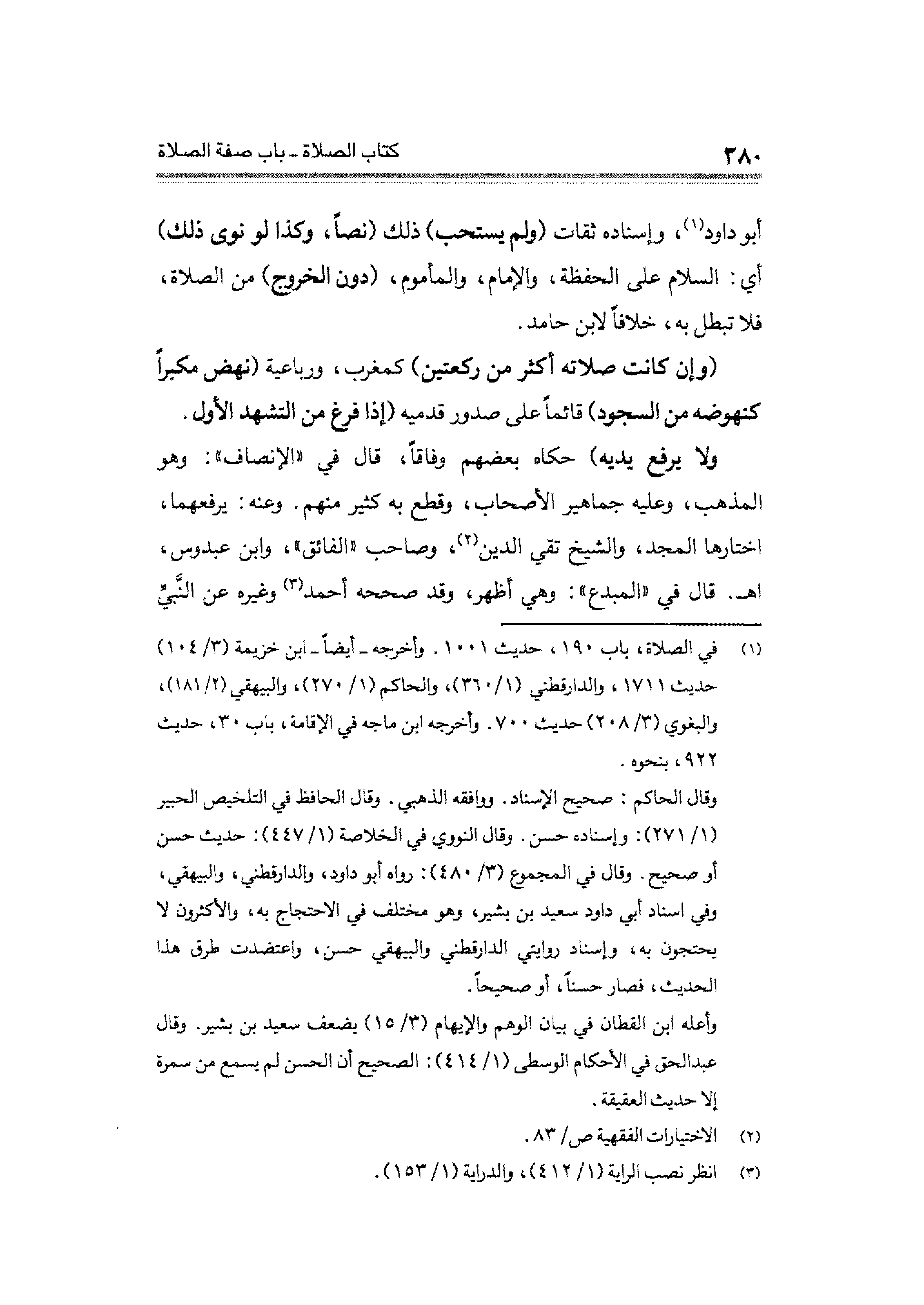 أبو داود (¬١)، وإسناده ثقات (ولم يستحب) ذلك (نصاً، وكذا لو نوى ذلك) أي: السلام على الحفظة، والإمام، والمأموم، (دون الخروج) من الصلاة، فلا تبطل به، خلافاً لإبن حامد.