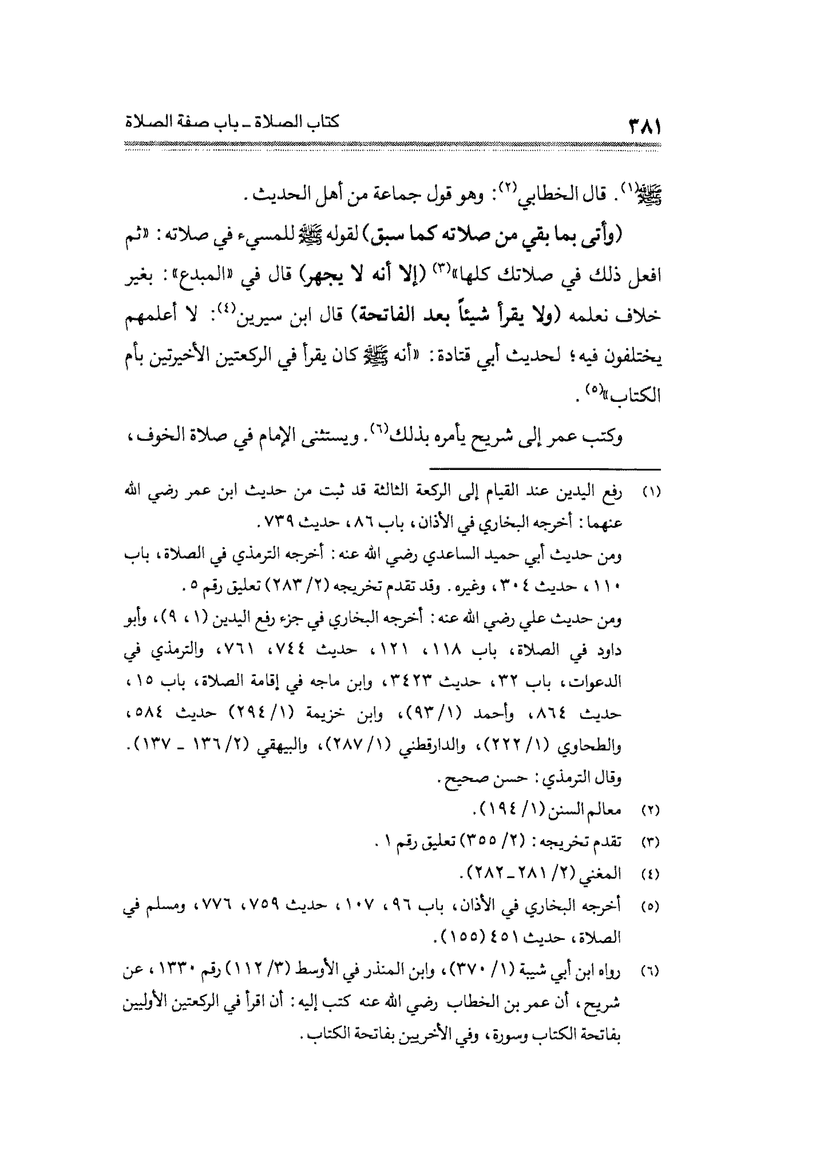 (¬١) رفع اليدين عند القيام إلى الركعة الثالثة قد ثبت من حديث ابن عمر رضي الله عنهما: أخرجه البخاري في الأذان، باب ٨٦، حديث ٧٣٩.