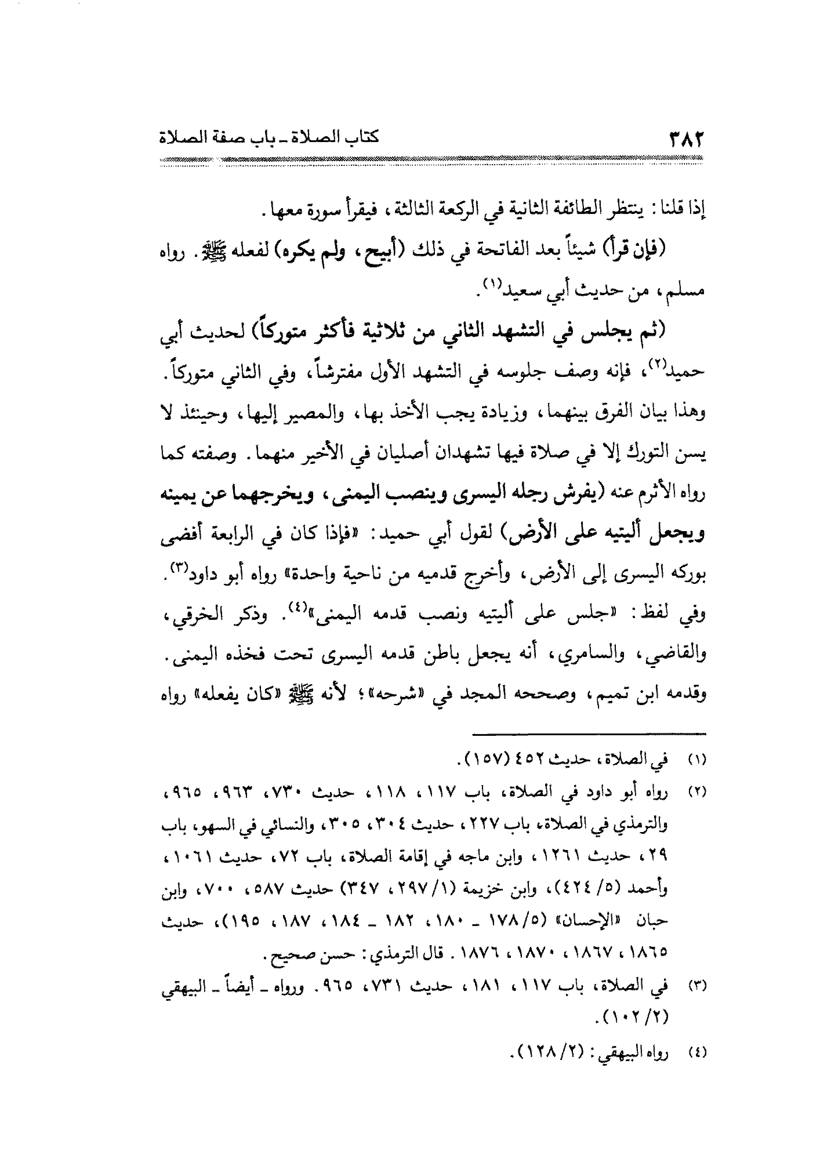 (¬٢) رواه أبو داود في الصلاة، باب ١١٧، ١١٨، حديث ٧٣٠، ٩٦٣، ٩٦٥، والترمذى في الصلاة، باب ٢٢٧، حديث ٣٠٤، ٣٠٥، والنسائي في السهو، باب ٢٩، حديث ١٢٦١، وابن ماجه في إقامة الصلاة، باب ٧٢، حديث ١٠٦١، وأحمد (٥/ ٤٢٤)، وابن خزيمة (١/ ٢٩٧، ٣٤٧) حديث ٥٨٧، ٧٠٠، وابن حبان "الإحسان" (٥/ ١٧٨ - ١٨٠، ١٨٢ - ١٨٤، ١٨٧، ١٩٥)، حديث ١٨٦٥، ١٨٦٧، ١٨٧٠، ١٨٧٦. قال الترمذي: حسن صحيح.