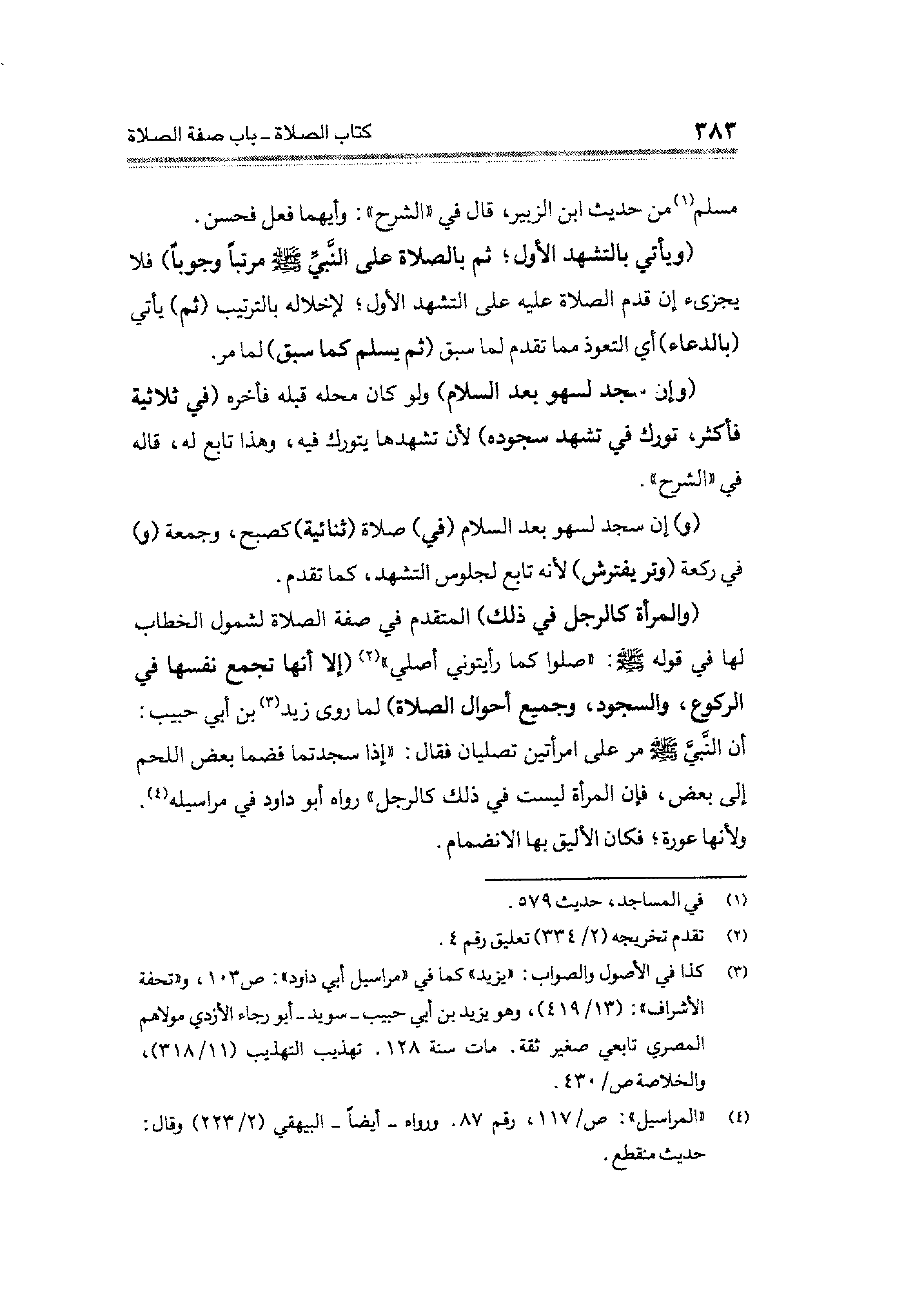 (والمرأة كالرجل في ذلك) المتقدم في صفة الصلاة لشمول الخطاب لها في قوله - صلى الله عليه وسلم -: "صلوا كما رأيتوني أصلي" (¬٢) (إلا أنها تجمع نفسها في الركوع، والسجود، وجميع أحوال الصلاة) لما روى زيد (¬٣) بن أبي حبيب: أن النَّبيِّ - صلى الله عليه وسلم - مر على امرأتين تصليان فقال: "إذا سجدتما فضما بعض اللحم إلى بعض، فإن المرأة ليست في ذلك كالرجل" رواه أبو داود في مراسيله" (¬٤). ولأنها عورة؛ فكان الأليق بها الانضمام.