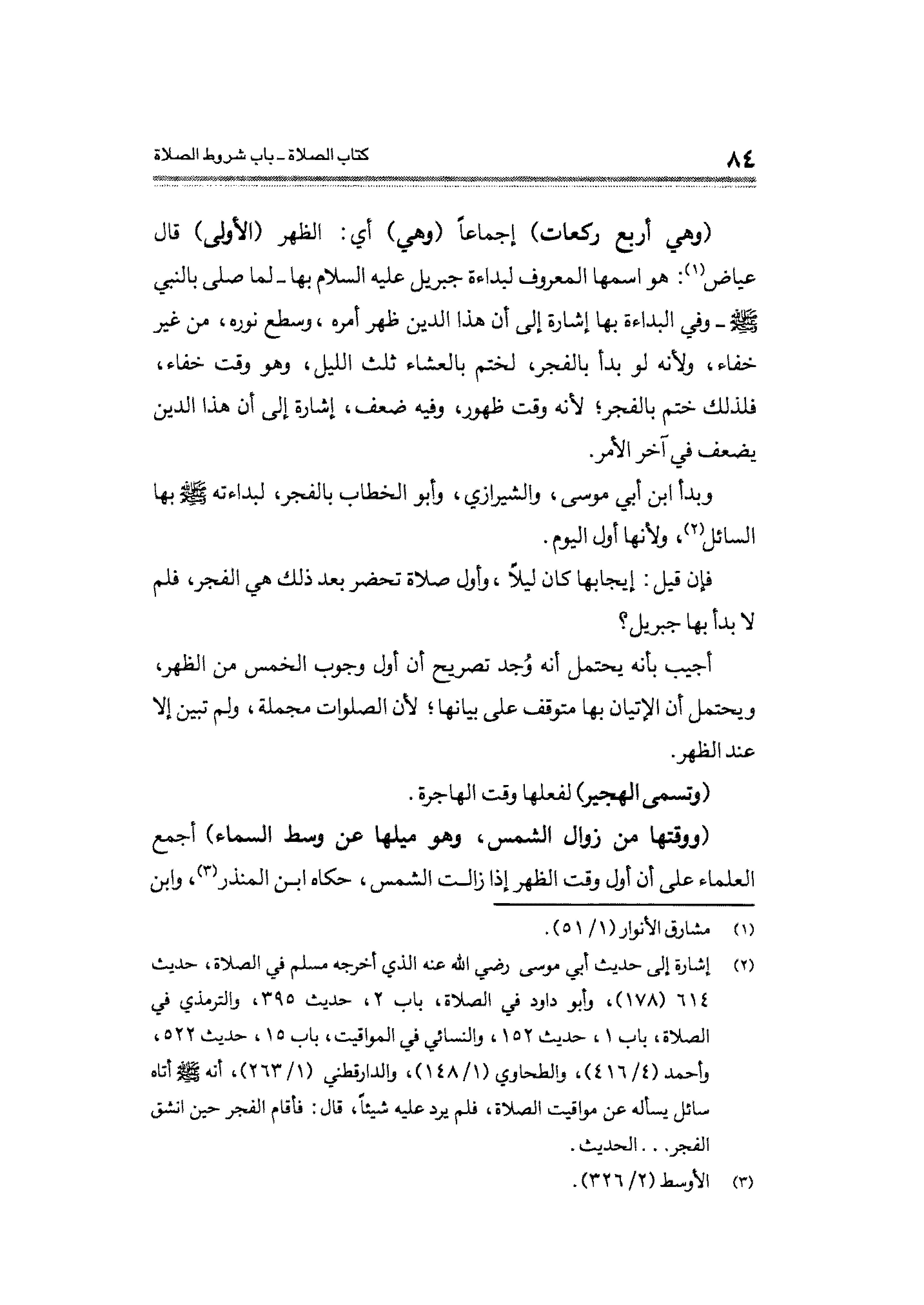 (وهي أربع ركعات) إجماعًا (وهي) أي: الظهر (الأولى) قال عياض (¬١): هو اسمها المعروف لبداءة جبريل عليه السلام بها - لما صلى بالنعي - صلى الله عليه وسلم - - وفي البداءة بها إشارة إلى أن هذا الدين ظهر أمره، وسطع نوره، من غير خفاء، ولأنه لو بدأ بالفجر، لختم بالعشاء ثلث الليل، وهو وقت خفاء، فلذلك ختم بالفجر؛ لأنه وقت ظهور، وفيه ضعف، إشارة إلى أن هذا الدين يضعف في آخر الأمر.