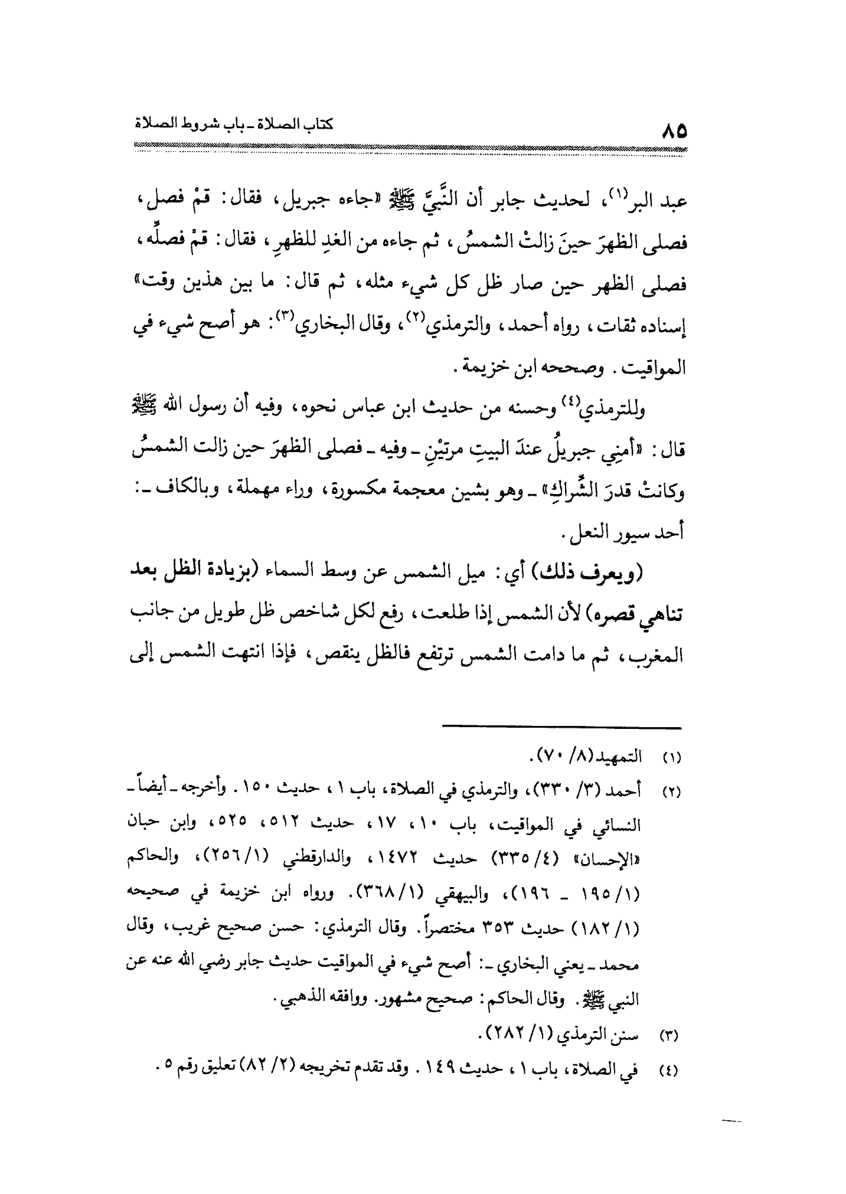 عبد البر (¬١)، لحديث جابر أن النَّبيَّ - صلى الله عليه وسلم - "جاءه جبريل، فقال: قمْ فصل، فصلى الظهرَ حينَ زالتْ الشمسُ، ثم جاءه من الغدِ للظهرٍ، فقال: قمْ فصلِّه، فصلى الظهر حين صار ظل كل شيء مثله، ثم قال: ما بين هذين وقت" إسناده ثقات، رواه أحمد، والترمذي (¬٢)، وقال البخاري (¬٣): هو أصح شيء في المواقيت. وصححه ابن خزيمة.