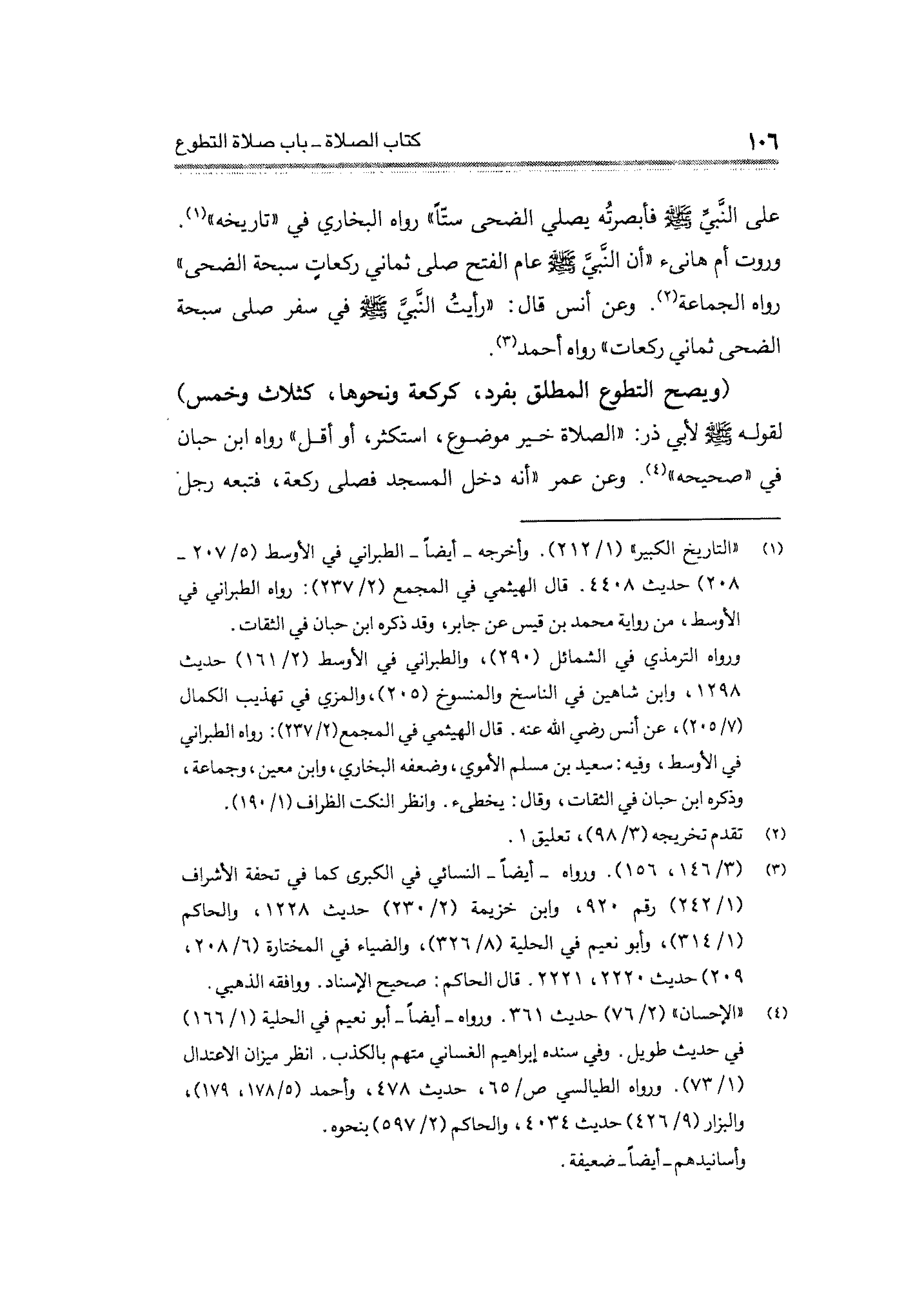 على النَّبيِّ - صلى الله عليه وسلم - فأبصرتُه يصلي الضحى ستًا" رواه البُخَارِيّ في "تاريخه" (¬١). وروت أم هانئ "أن النَّبي - صلى الله عليه وسلم - عام الفتح صلى ثماني ركعاتِ سبحة الضحى" رواه الجماعة (¬٢). وعن أنس قال: "رأيتُ النبيَّ - صلى الله عليه وسلم - في سفر صلى سبحة الضحى ثماني ركعات" رواه أَحْمد (¬٣).