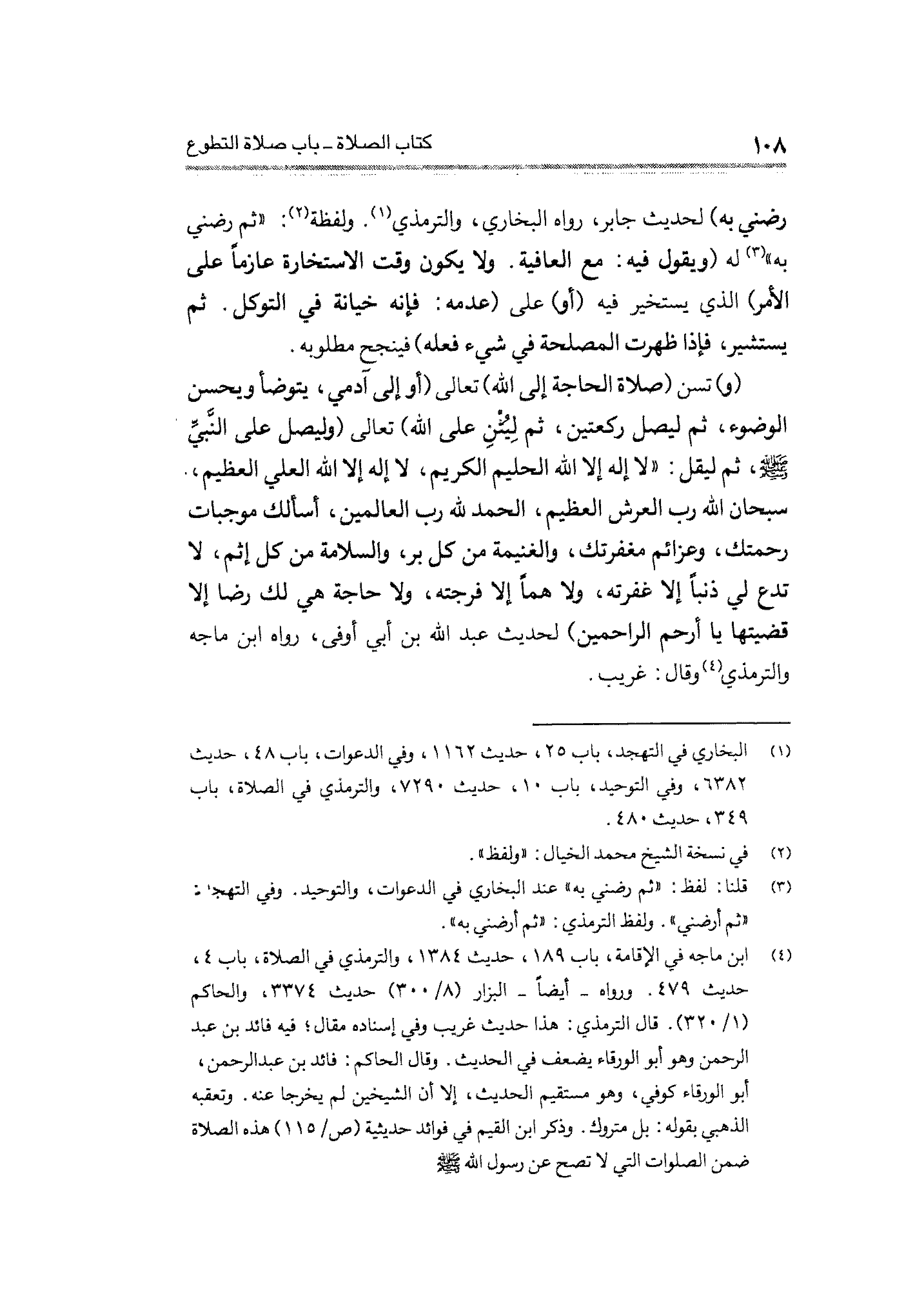 (و) تسن (صلاة الحاجة إلى الله) تعالى (أو إلى آدمي، يتوضأ ويحسن الوضوء ثم ليصل ركعتين، ثم لِيُثْنِ على الله) تعالى (وليصل على النبيِّ - صلى الله عليه وسلم -، ثم ليقل: "لا إله إلَّا الله الحليم الكريم، لا إله إلَّا الله العلي العظيم". سبحان الله رب العرش العظيم، الحمد لله رب العالمين، أسألك موجبات رحمتك، وعزائم مغفرتك، والغنيمة من كل بر، والسلامة من كل إثم، لا تدع لي ذنبًا إلَّا غفرنه، ولا همًا إلَّا فرجته، ولا حاجة هي لك رضا إلَّا قضيتها يَا أرحم الراحمين) لحديث عبد الله بن أبي أوفى، رواه ابن ماجه والترمذي (¬٤) وقال: غريب.