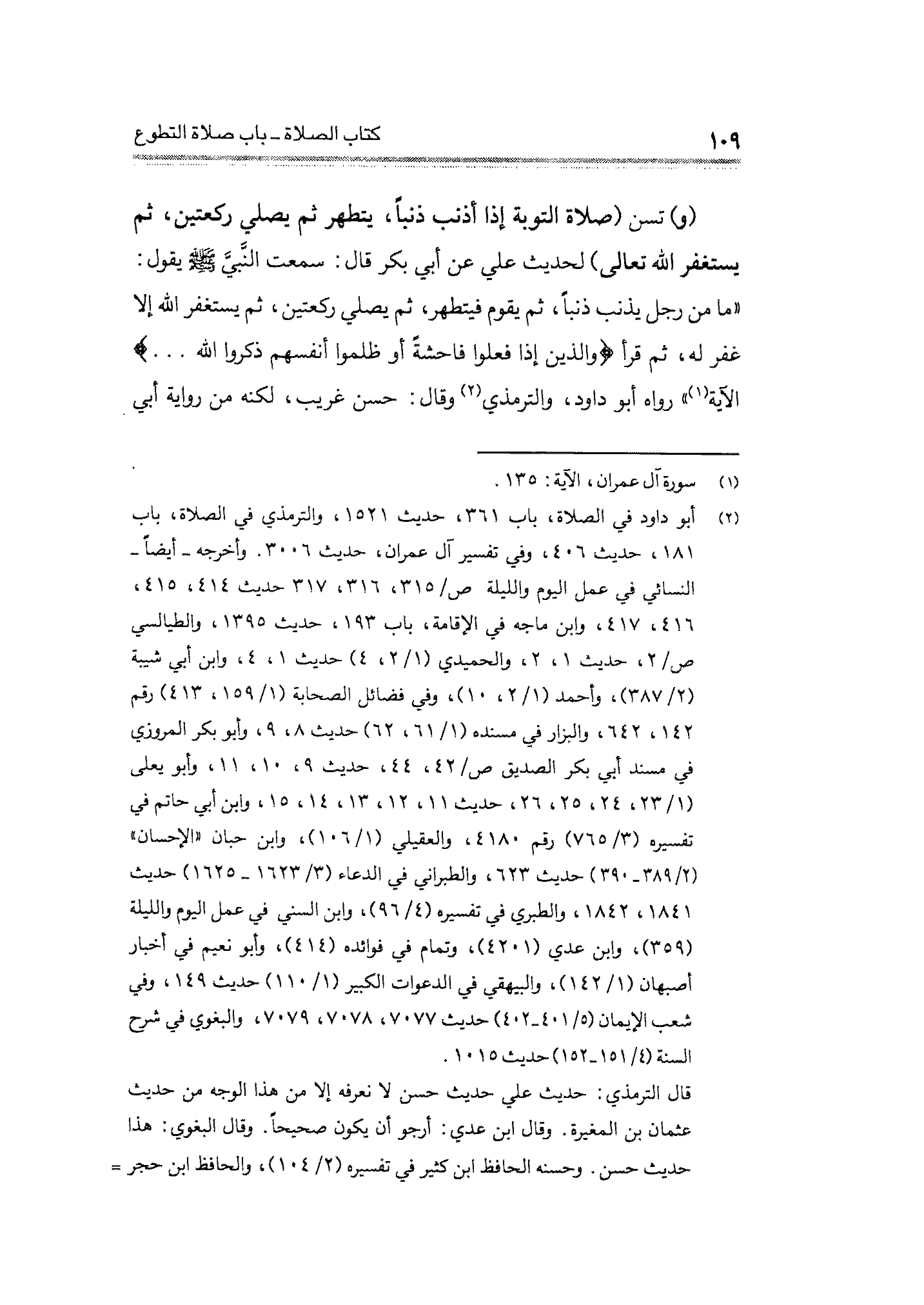 (و) تسن (صلاة التوبة إذا أذنب ذنبًا، يتطهر ثم يصلي ركعتين، ثم يستغفر الله تعالى) لحديث علي عن أبي بكر قال: سمعت النَّبي - صلى الله عليه وسلم - يقول: "ما من رجل يذنب ذنبًا، ثم يقوم فيتطهر، ثم يصلي ركعتين، ثم يستغفر الله إلَّا غفر له، ثم قرأ {وَالَّذِينَ إِذَا فَعَلُوا فَاحِشَةً أَوْ ظَلَمُوا أَنْفُسَهُمْ ذَكَرُوا اللَّهَ ... } الآية (¬١) رواه أبو داود، والتِّرمذيّ (¬٢) وقال: حسن غريب، لكنه من رواية أبي