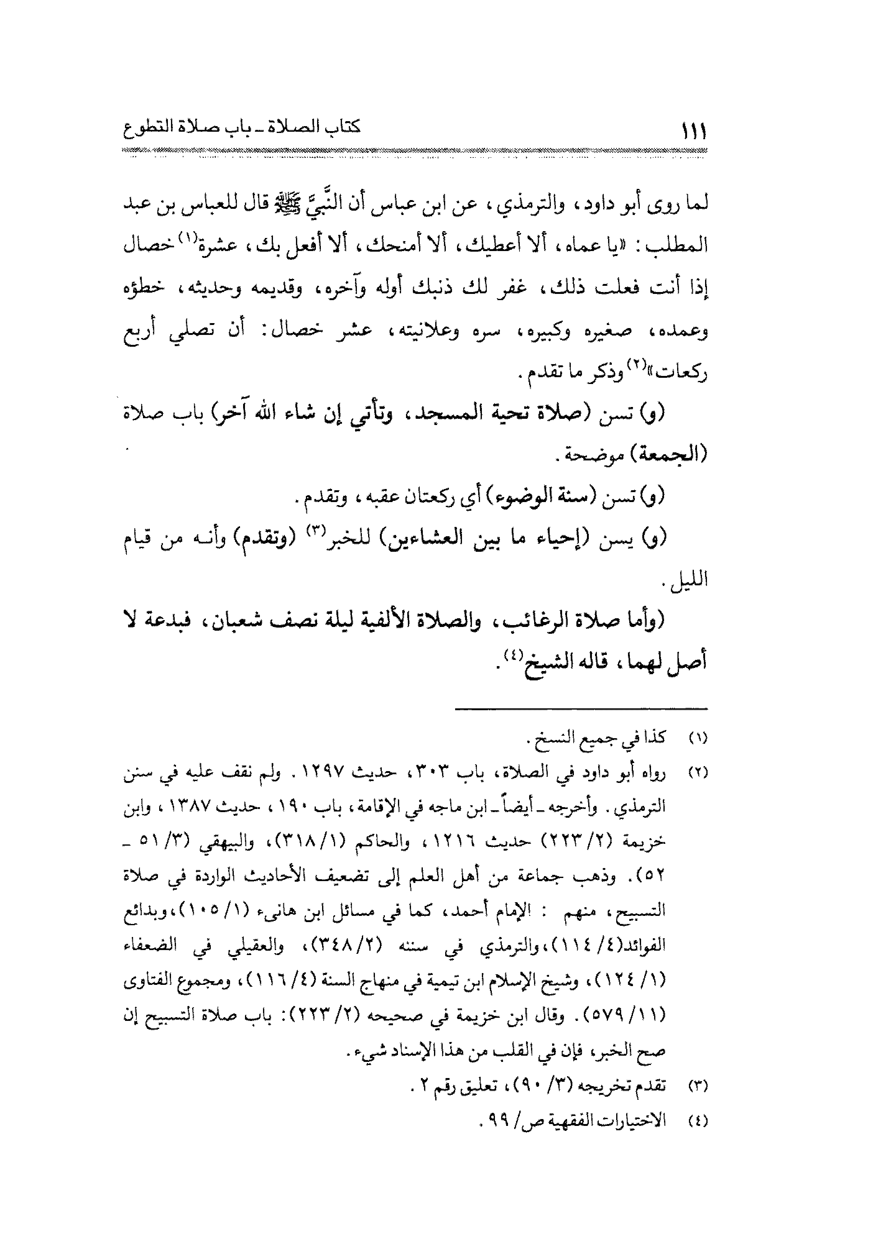 (¬٢) رواه أبو نعيم في الصلاة، باب ٣٠٣، حديث ١٢٩٧. ولم نقف عليه في سنن الترمذي. وأخرجه -أيضًا- ابن ماجه في الإقامة، باب ١٩٠، حديث ١٣٨٧، وابن خزيمة (٢/ ٢٢٣) حديث ١٢١٦، والحاكم (١/ ٣١٨)، والبيهقي (٣/ ٥١ - ٥٢). وذهب جماعة من أهل العلم إلى تضعيف الأحاديث الواردة في صلاة التسبيح، منهم: الإمام أحمد، كما في مسائل ابن هانئ (١/ ١٠٥)، وبدائع الفوائد (٤/ ١١٤)، والترمذي في سننه (٢/ ٣٤٨)، والعقيلي في الضعفاء (١/ ١٢٤)، وشيخ الإسلام ابن تيمية في منهاج السنة (٤/ ١١٦)، ومجموع الفتاوى (١١/ ٥٧٩). وقال ابن خزيمة في صحيحه (٢/ ٢٢٣): باب صلاة التسبيح إن صح الخبر، فإن في القلب من هذا الإسناد شيء.