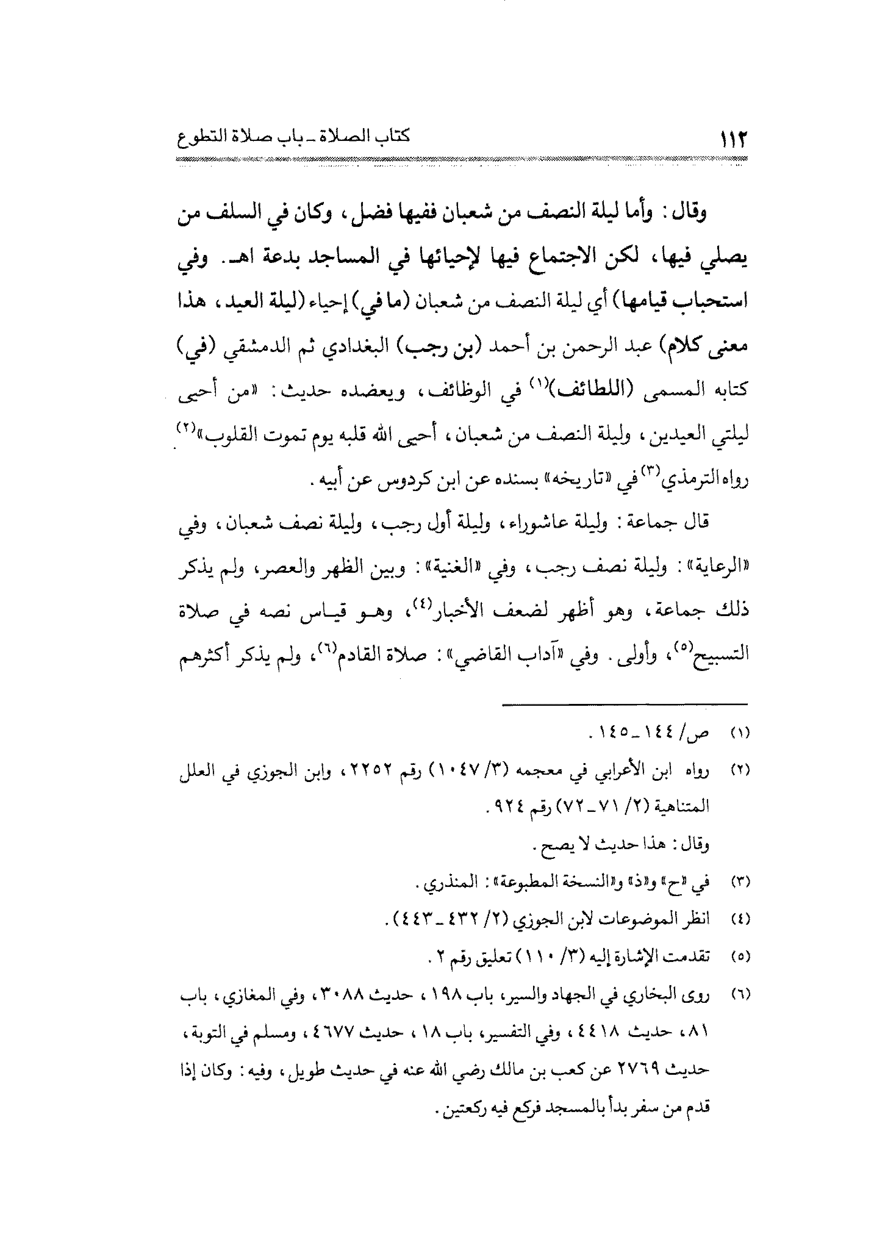 وقال: وأما ليلة النصف من شعبان ففيها فضل، وكان في السلف من يصلي فيها، لكن الاجتماع فيها لإحيائها في المساجد بدعة اه. وفي استحباب قيامها) أي ليلة النصف من شعبان (ما في) إحياء (ليلة العيد، هذا معنى كلام) عبد الرحمن بن أحمد (بن رجب) البغدادي ثم الدمشقي (في) كتابه المسمى (اللطائف) (¬١) في الوظائف، ويعضده حديث: "من أحيى ليلتي العيدين، وليلة النصف من شعبان، أحيى الله قلبه يوم تموت القلوب" (¬٢) ورواه الترمذي (¬٣) في "تاريخه" بسنده عن ابن كردوس عن أبيه.