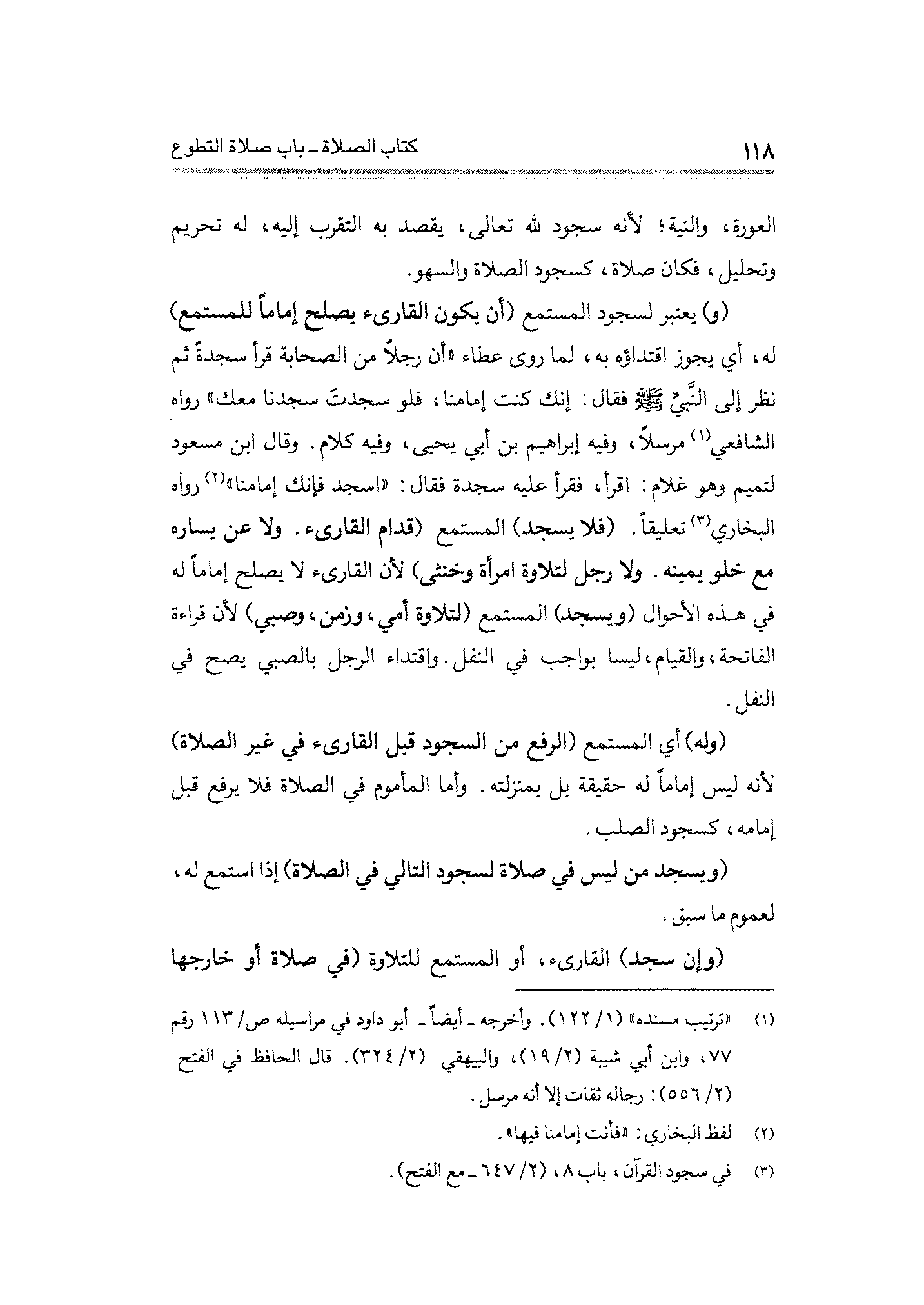 (و) يعتبر لسجود المستمع (أن يكون القارئ يصلح إمامًا للمستمع) له، أي يجوز اقتداؤه به، لما روى عطاء "أن رجلًا من الصحابة قرأ سجدةً ثم نظر إلى النَّبيِّ - صلى الله عليه وسلم - فقال: إنك كنت إمامنا، فلو سجدتَ سجدنا معك" رواه الشافعي (¬١) مرسلًا، وفيه إبراهيم بن أبي يحيى، وفيه كلام. وقال ابن مسعود لتميم وهو غلام: أقرأ، فقرأ عليه سجدة فقال: "اسجد فإنك إمامنا" (¬٢) رواه البخاري (¬٣) تعليقًا. (فلا يسجد) المستمع (قدام القارئ. ولا عن يساره مع خلو يمينه. ولا رجل لتلاوة امرأة وخنثى) لأن القارئ لا يصلح إمامًا له في هذه الأحوال (ويسجد) المستمع (لتلاوة أمي، وزمن، وصبي) لأن قراءة الفاتحة، والقيام، ليسا بواجب في النفل. واقتداء الرجل بالصبي يصح في النفل.
