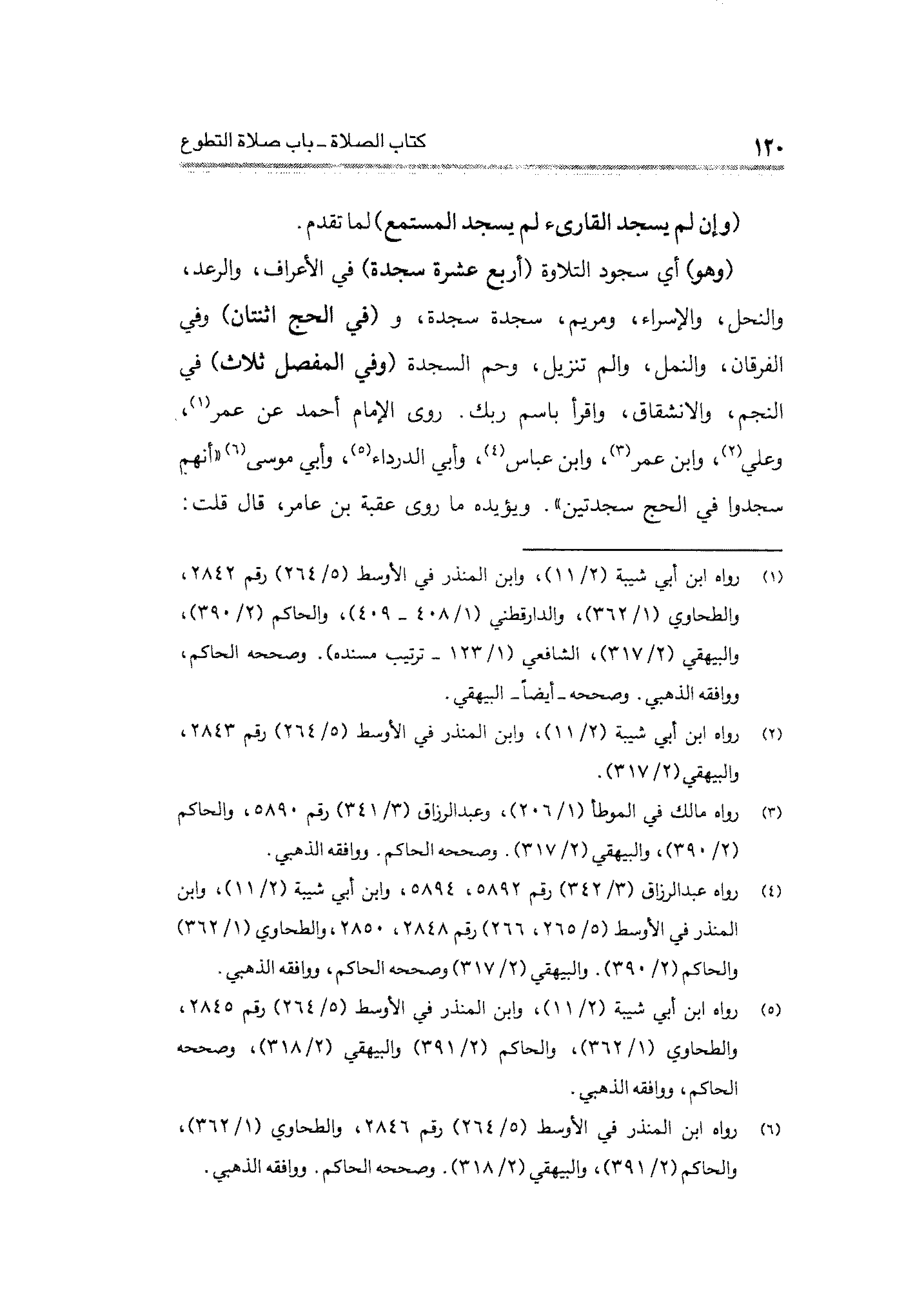 (وهو) أي سجود التلاوة (أربع عشرة سجدة) في الأعراف، والرعد، والنحل، والإسراء، ومريم، سجدة سجدة، و (في الحج اثنتان) وفى الفرقان، والنمل، والم تنزيل، وحم السجدة (وفي المفصل ثلاث) في النجم، والانشقاق، واقرأ باسم ربك. روى الإمام أحمد عن عمر (¬١)، وعلي (¬٢)، وابن عمر (¬٣)، وابن عباس (¬٤)، وأبي الدرداء (¬٥)، وأبي موسى (¬٦) "أنهم سجدوا في الحج سجدتين". ويؤيده ما روى عقبة بن عامر، قال قلت: