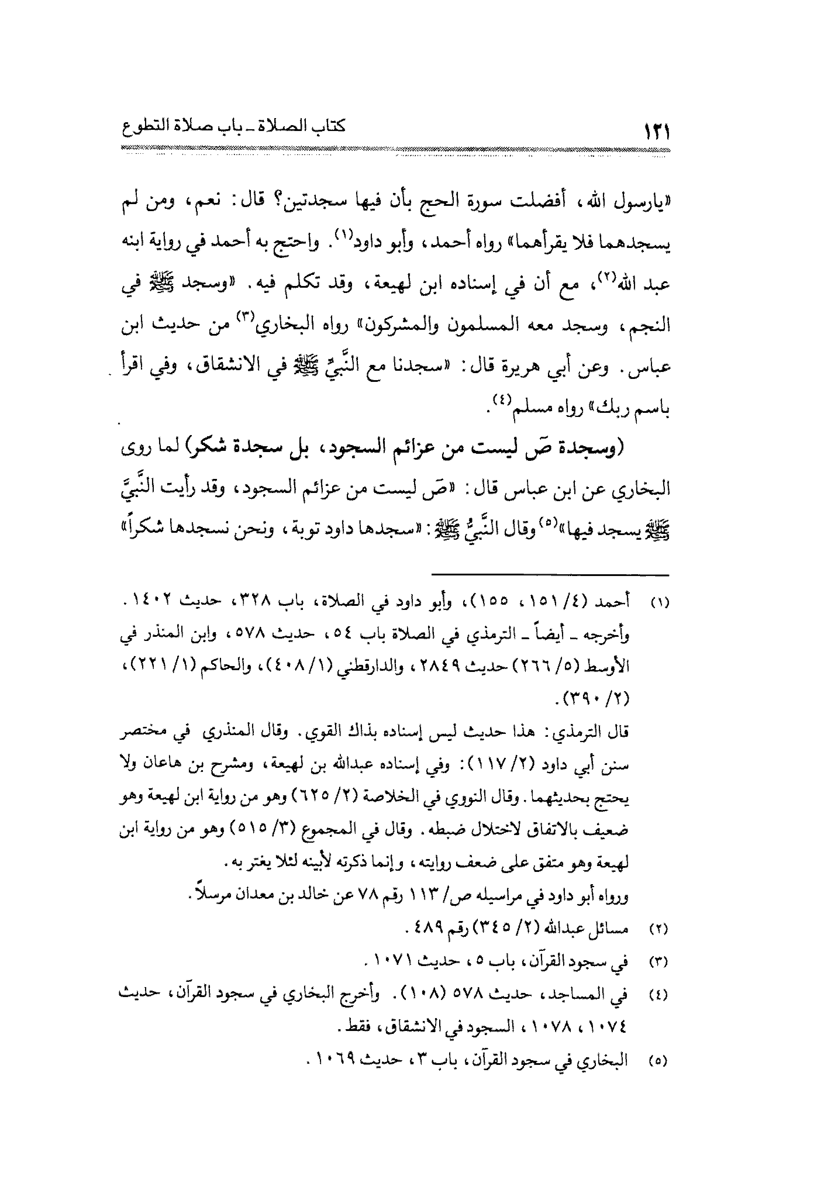 (وسجدة صَ ليست من عزائم السجود، بل سجدة شكر) لما ووى البخاري عن ابن عباس قال: "ص ليست من عزائم السجود، وقد رأيت النبي - صلى الله عليه وسلم - سجد فيها" (¬٥) وقال النبي - صلى الله عليه وسلم -: "سجدها داود توبة، ونحن نسجدها شكرًا"