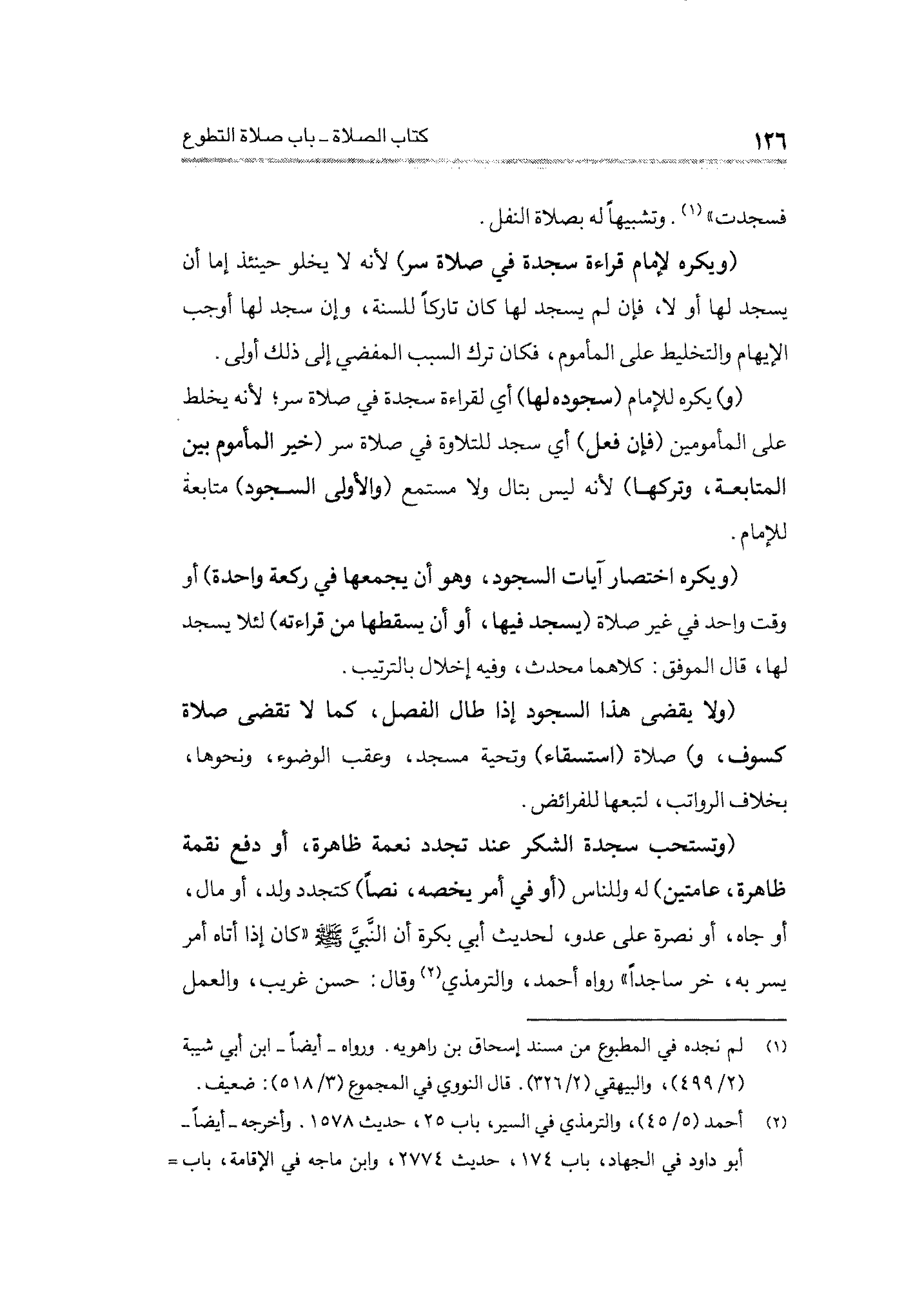 (و) يكره للإمام (سجوده لها) أي لقراءة سجدة في صلاة سر؛ لأنه يخلط على المأمومين (فإن فعل) أي سجد لتلاوة في صلاة سر (خبر المأموم بين المتابعة، وتركها) لأنه ليس بتال ولا مستمع (والأولى السجود) متابعة للإمام.
