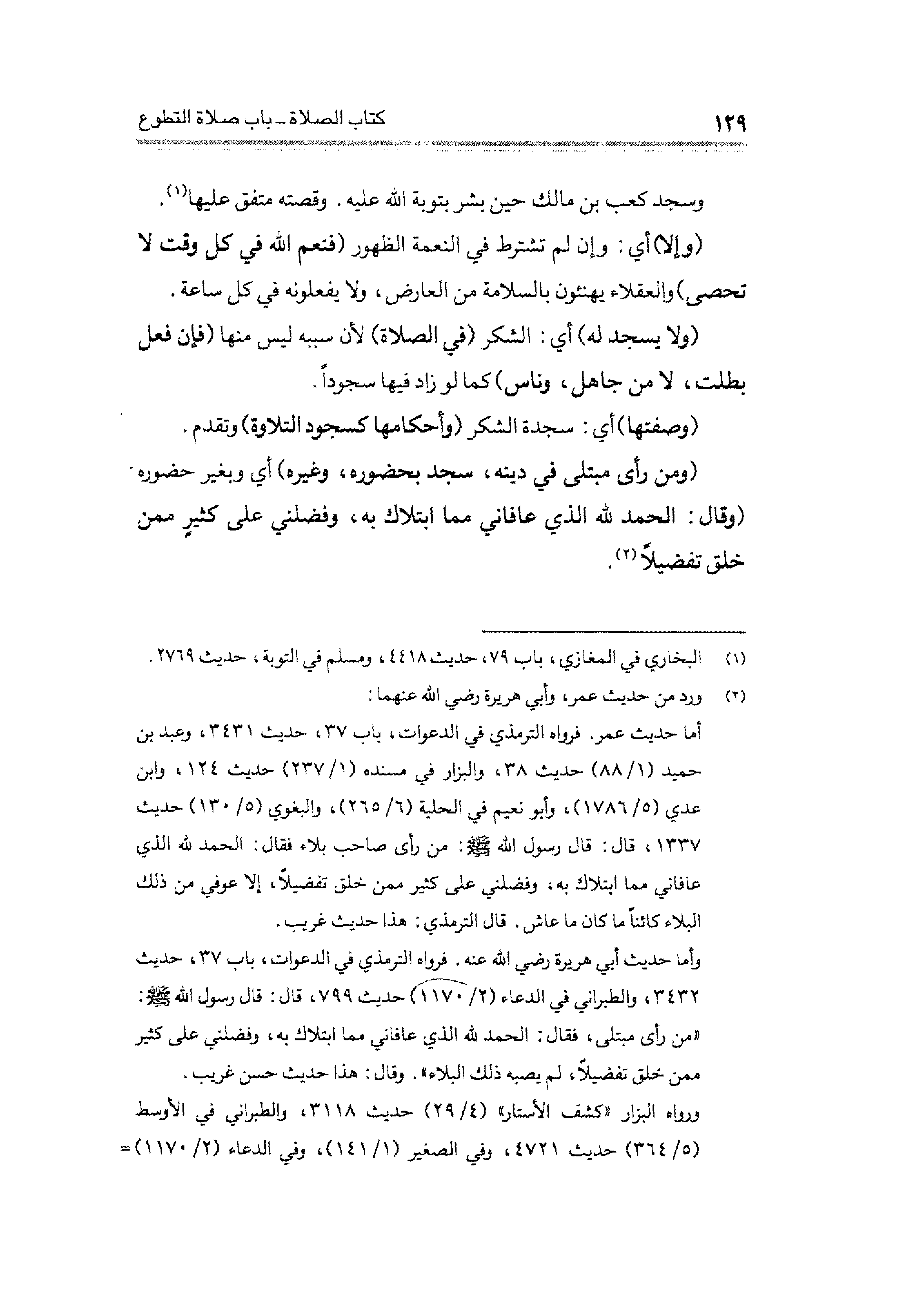 (ومن رأى مبتلى في دينه، سجد بحضوره، وغيره) أي وبغير حضوره (وقال: الحمد لله الذي عافاني مما ابتلاك به، وفضلني على كثيرٍ ممن خلق تفضيلًا (¬٢).