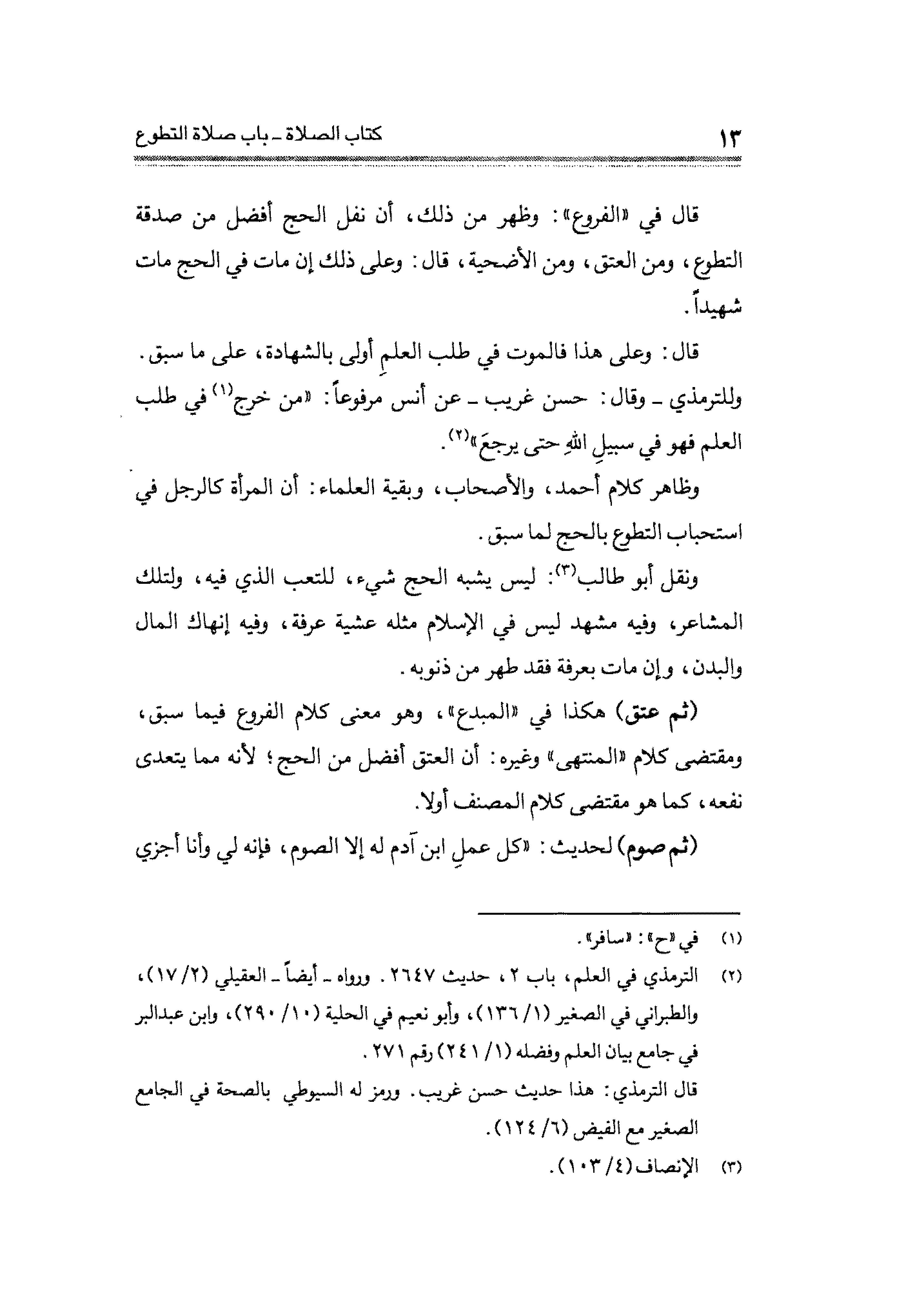 قال في "الفروع": وظهر من ذلك، أن نفل الحج أفضل من صدقة التطوع، ومن العتق، ومن الأضحية، قال: وعلى ذلك إن مات في الحج مات شهيدًا.