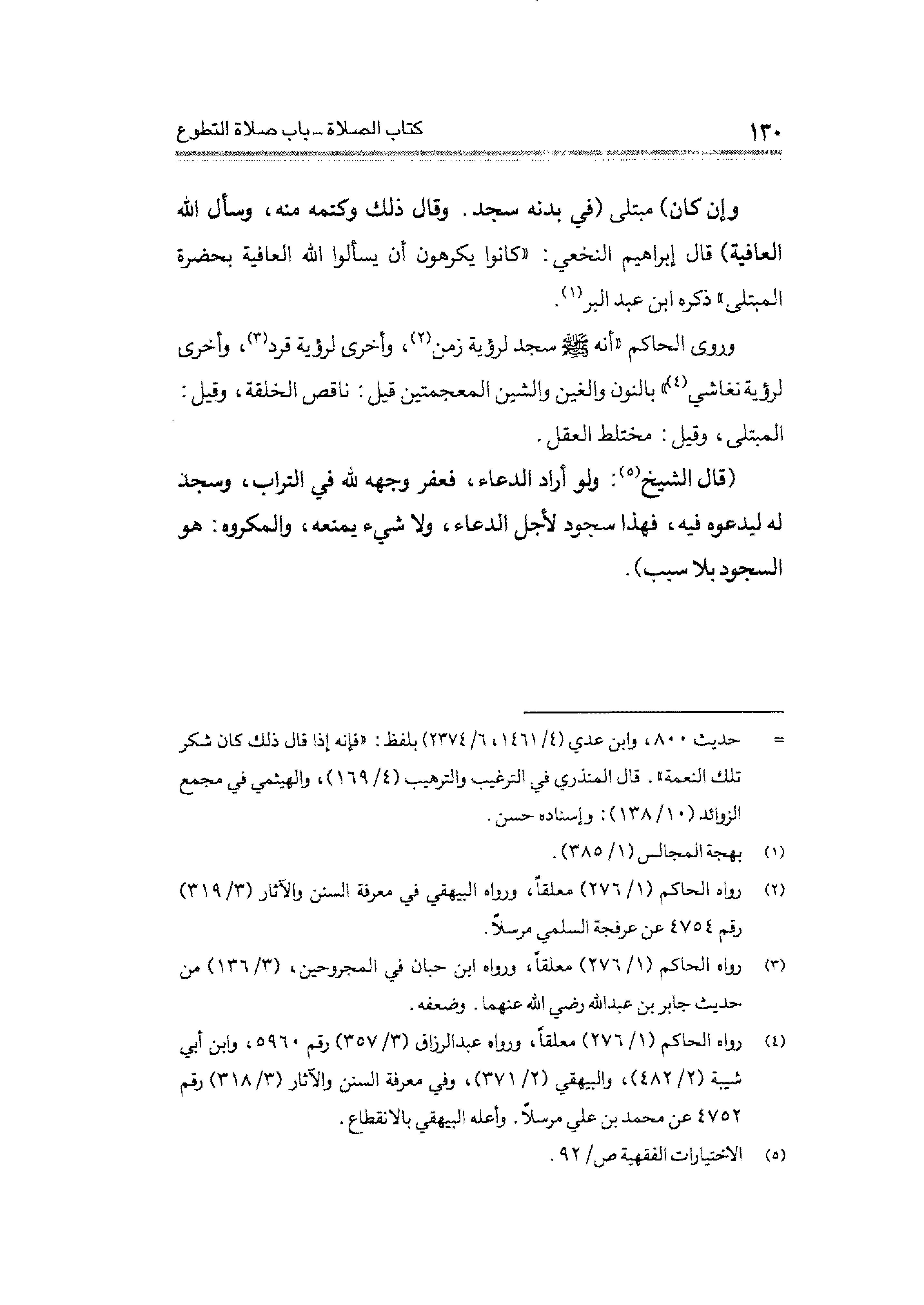 وإن كان) مبتلى (في بدنه سجد. وقال ذلك وكتمه منه، وسأل الله العافية) قال إبراهيم النخعي: "كانوا يكرهون أن يسألوا الله العافية بحضرة المبتلى" ذكره ابن عبد البر (¬١).