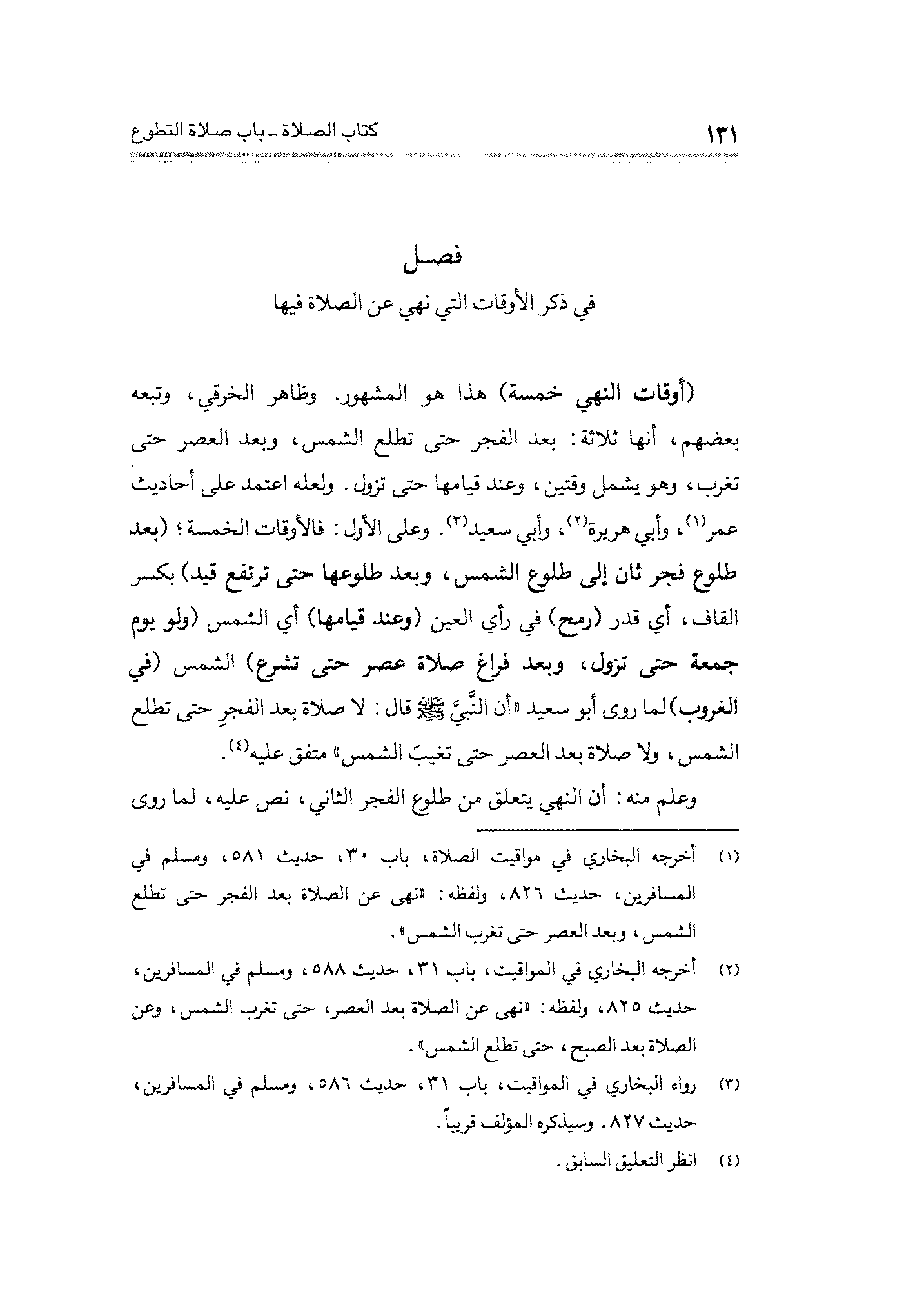 (أوقات النهي خمسة) هذا هو المشهور. وظاهر الخرقي، وتبعه بعضهم، أنها ثلاثة: بعد الفجر حتى تطلع الشمس، وبعد العصر حتى تغرب، وهو يشمل وقتين، وعند قيامها حتى تزول. ولعله اعتمد على أحاديث عمر (¬١)، وأبي هريرة (¬٢)، وأبي سعيد (¬٣). وعلى الأول: فالأوقات الخمسة؛ (بعد طلوع فجر ثان إلى طلوع الشمس، وبعد طلوعها حتى ترتفع قيد) بكسر القاف، أي قدر (رمح) في رأي العين (وعند قيامها) أي الشمس (ولو يوم جمعة حتى تزول، وبعد فراغ صلاة عصر حتى تشرع) الشمس (في الغروب) لما روى أبو سعيد "أن النَّبيَّ - صلى الله عليه وسلم - قال: لا صلاة بعد الفجرِ حتى تطلع الشمس، ولا صلاة بعد العصر حتى تغيبَ الشمس" متفق عليه (¬٤).
