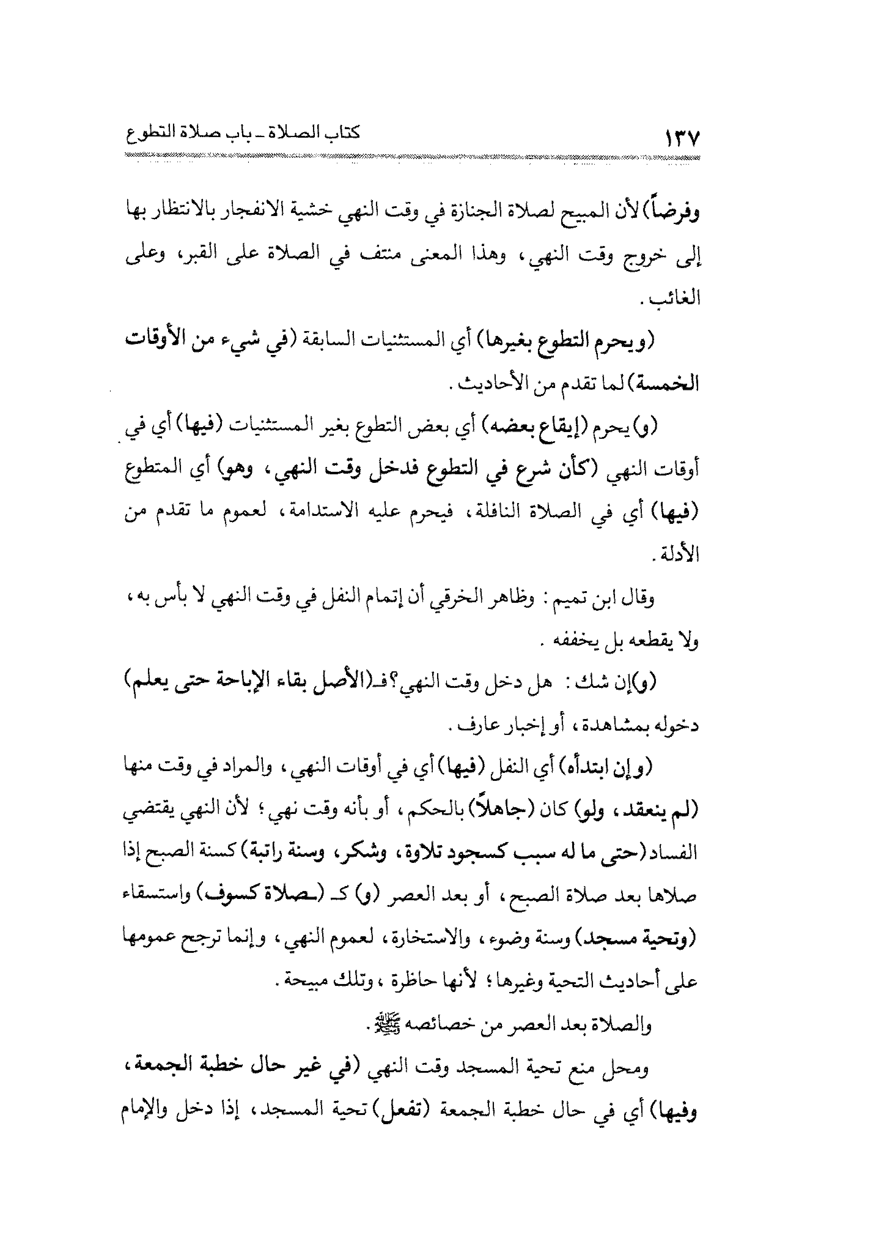 (و) يحرم (إيقاع بعضه) أي بعض التطوع بغير المستثنيات (فيها) أي في أوقات النهي (كأن شرع في التطوع فدخل وقت النهي، وهو) أي المتطوع (فيها) أي في الصلاة النافلة، فيحرم عليه الاستدامة، لعموم ما تقدم من الأدلة.