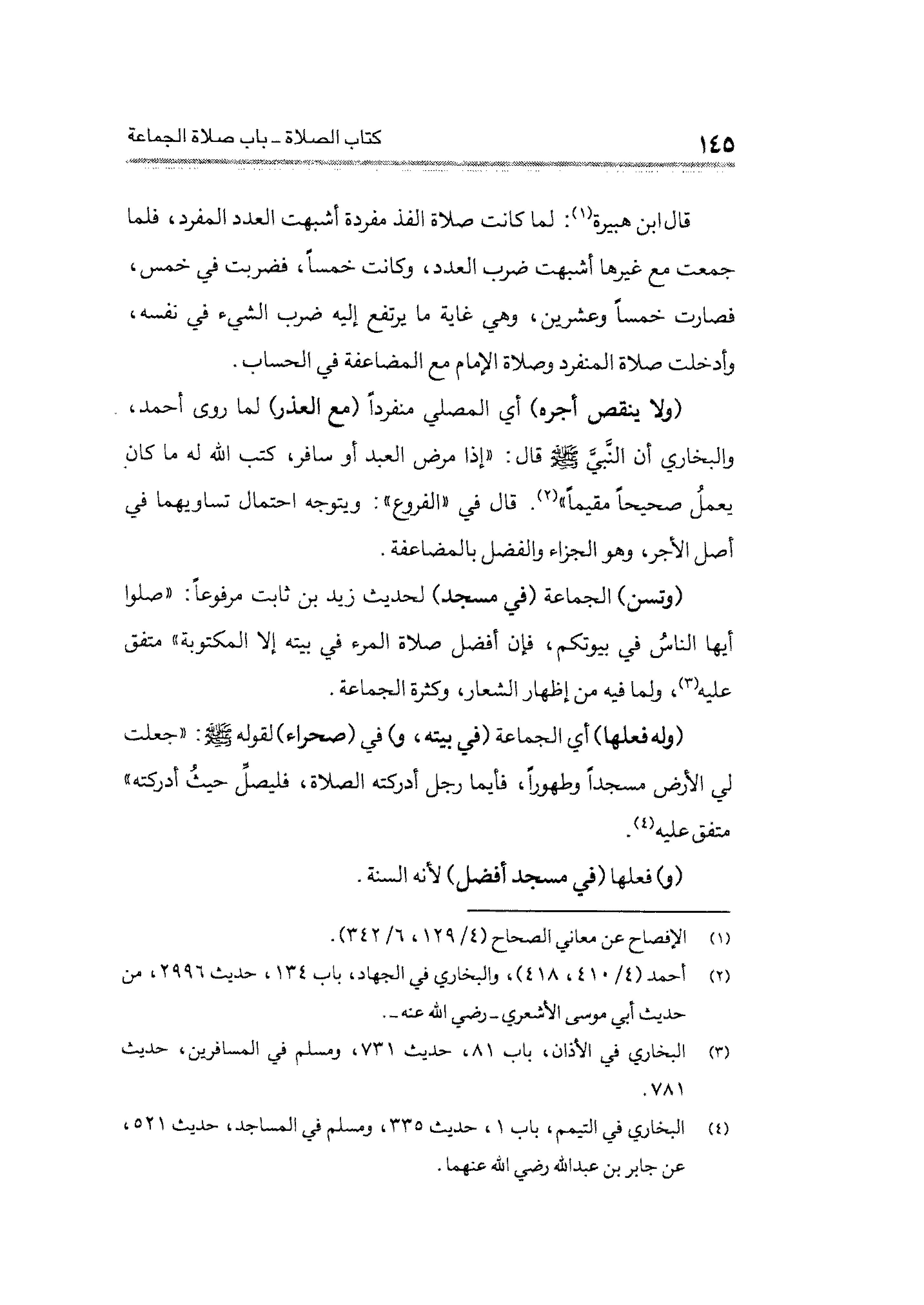 (ولا ينقص أجره) أي المصلي منفردًا (مع العذر) لما روى أحمد، والبخاري أن النَّبيّ - صلى الله عليه وسلم - قال: "إذا مرض العبد أو سافر، كتب الله له ما كان يعملُ صحيحًا مقيمًا" (¬٢). قال في "الفروع": ويتوجه احتمال تساويهما في أصل الأجر، وهو الجزاء والفضل بالمضاعفة، (وتسن) الجماعة (في مسجد) لحديث زيد بن ثابت مرفوعًا: "صلوا أيها النَّاس في بيوتكم، فكان أفضل صلاة المرء في بيته إلَّا المكتوبة" متَّفقٌ عليه (¬٣)، ولما فيه من إظهار الشعار، وكثرة الجماعة.