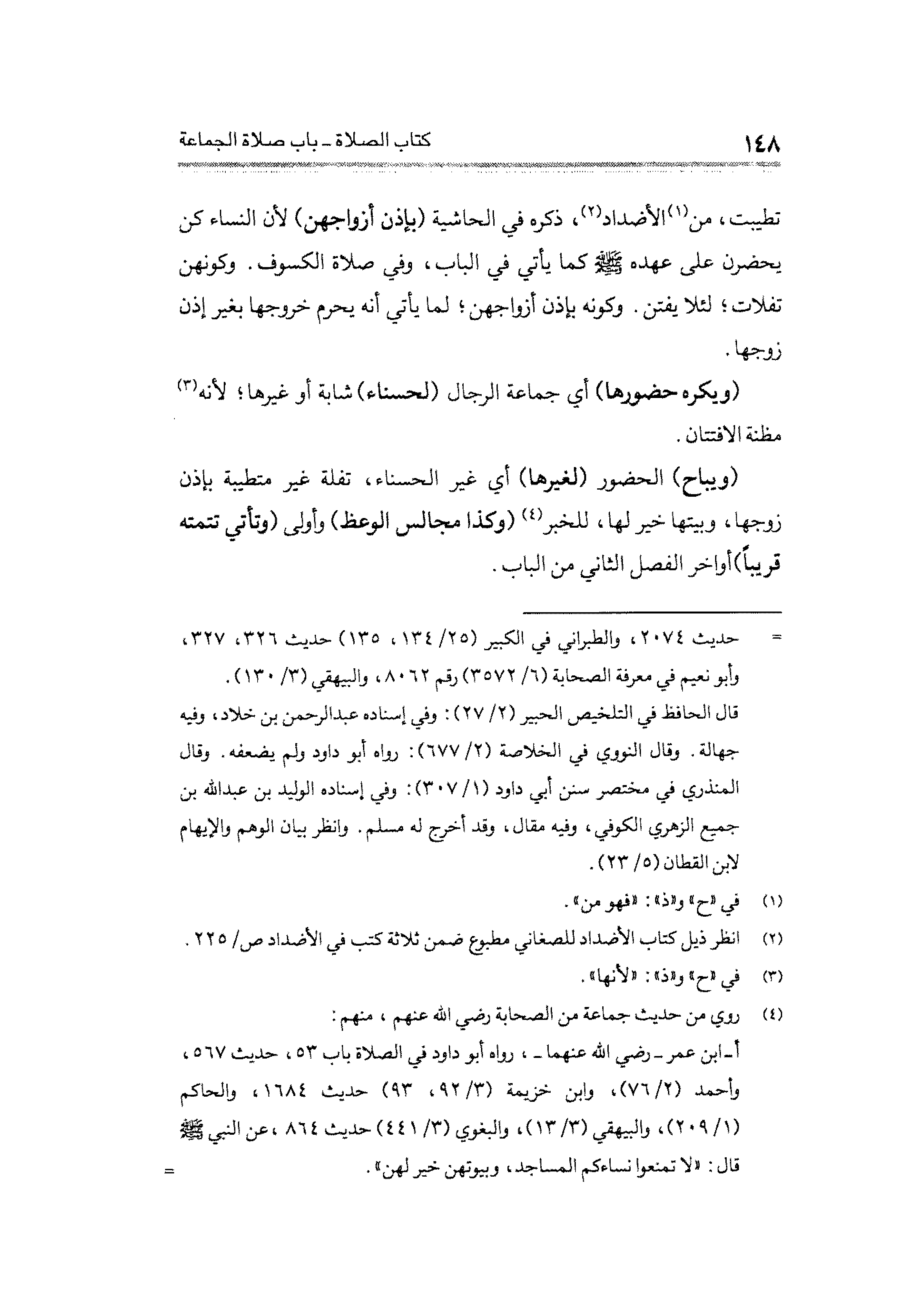 (ويباح) الحضور (لغيرها) أي غير الحسناء، تفلة غير متطيبة بإذن زوجها، وبيتها خير لها، للخبر (¬٤) (وكذا مجالس الوعظ) وأولى (وتأتي تتمته قريبًا) أواخر الفصل الثَّاني من الباب.