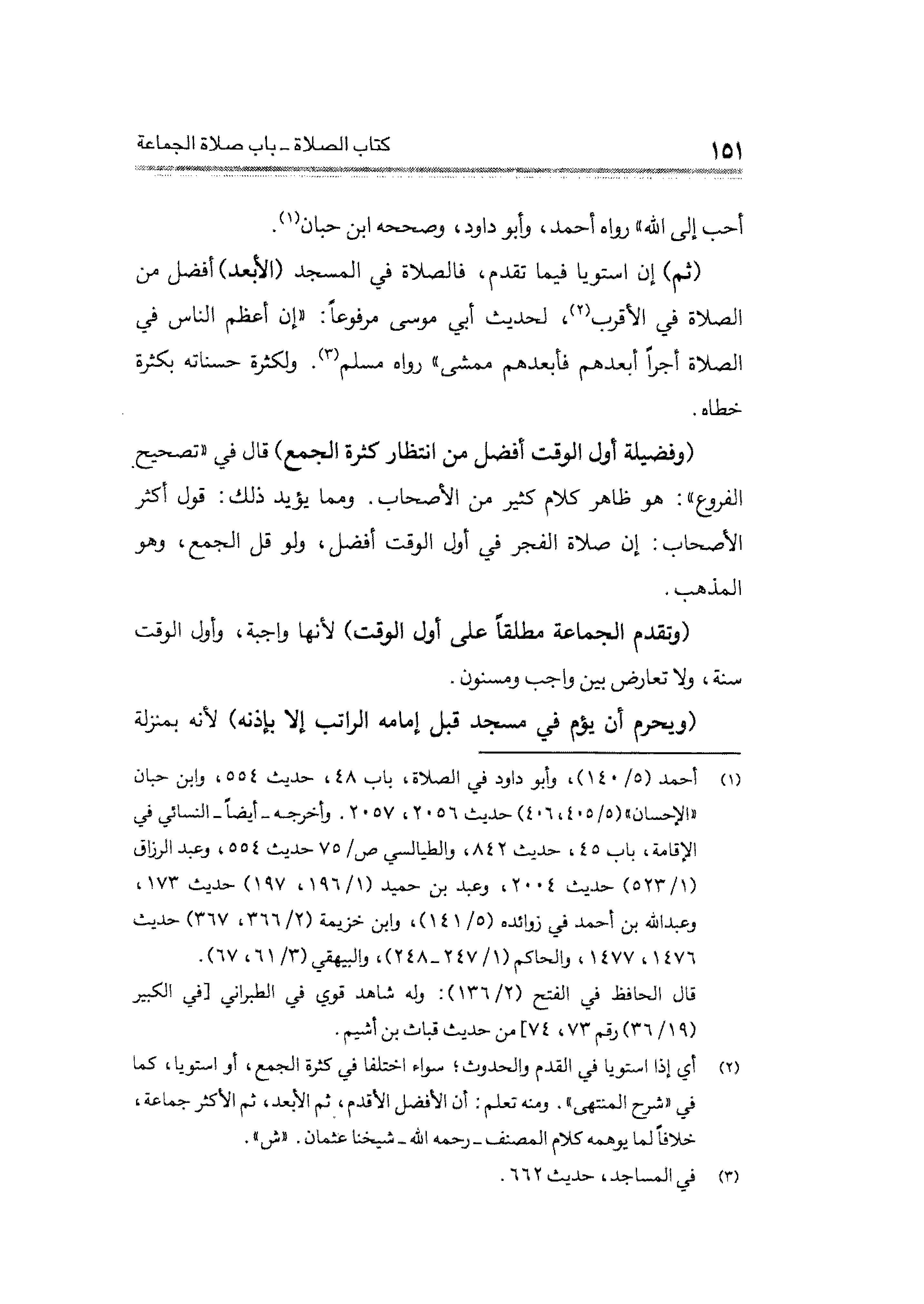 (¬٢) أي إذا استويا في القدم والحدوث؛ سواء اختلفا في كثرة الجمع، أو استويا، كما في "شرح المنتهى". ومنه تعلم: أن الأفضل الأقدم، ثم الأبعد، ثم الأكثر جماعة، خلافًا لما يوهمه كلام المصف -رحمه الله- شيخنا عثمان. "ش".
