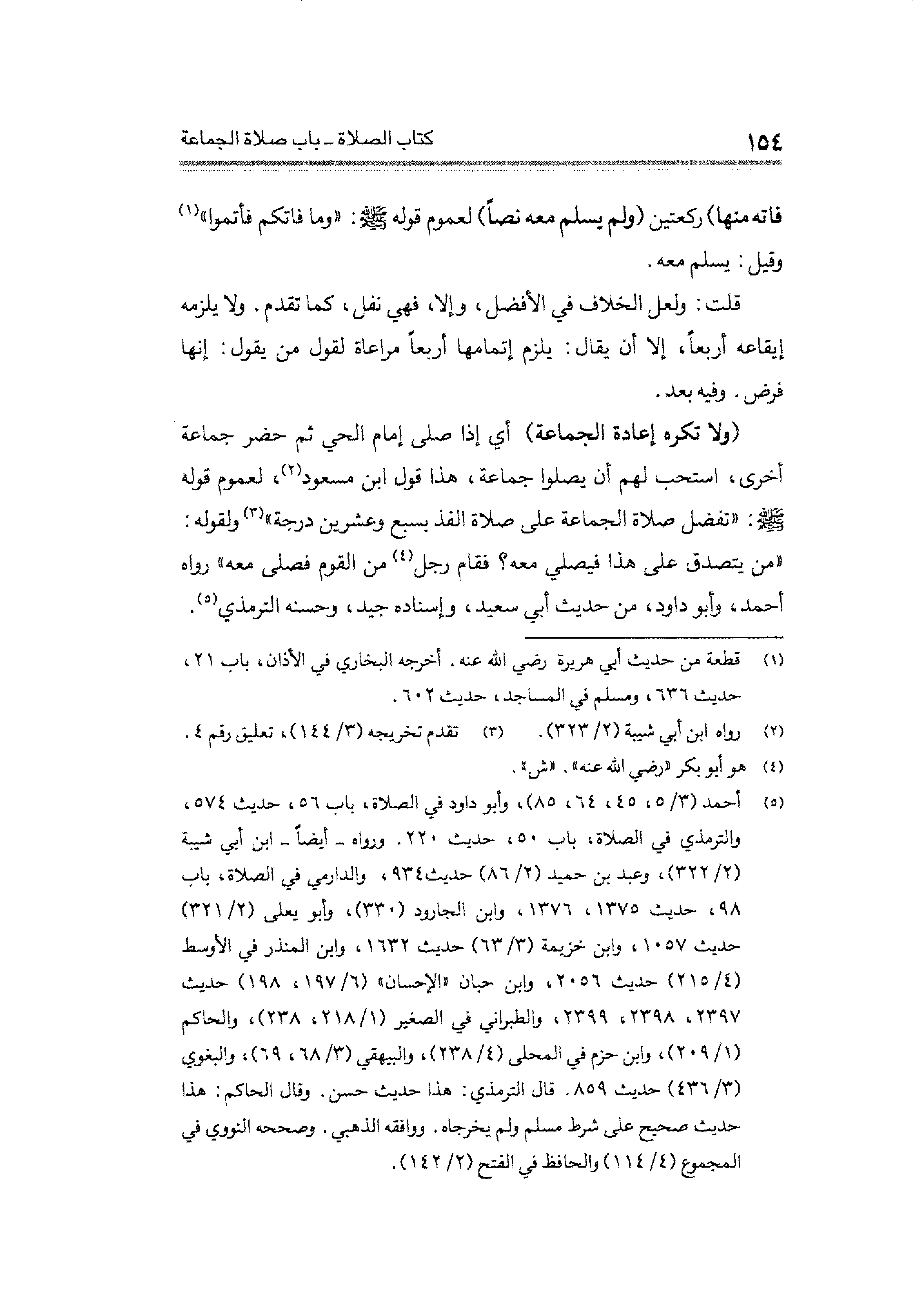 (¬٥) أحمد (٣/ ٥، ٤٥، ٦٤، ٨٥)، وأبو داود في الصلاة، باب ٥٦، حديث ٥٧٤، والترمذي في الصلاة، باب ٥٠، حديث ٢٢٠. ورواه -أيضًا- ابن أبي شيبة (٢/ ٣٢٢)، وعبد بن حميد (٢/ ٨٦) حديث ٩٣٤، والدارمي في الصلاة، باب ٩٨، حديث ١٣٧٥، ١٣٧٦، وابن الجارود (٣٣٠)، وأبو يعلى (٢/ ٣٢١) حديث ١٠٥٧، وابن خزيمة (٣/ ٦٣) حديث ١٦٣٢، وابن المنذر في الأوسط (٤/ ٢١٥) حديث ٢٠٥٦، وابن حبان "الإحسان" (٦/ ١٩٧، ١٩٨) حديث ٢٣٩٧، ٢٣٩٨، ٢٣٩٩، والطبراني في الصغير (١/ ٢١٨، ٢٣٨)، والحاكم (١/ ٢٠٩)، وابن حزم في المحلى (٤/ ٢٣٨)، والبيهقي (٣/ ٦٨، ٦٩)، والبغوي (٣/ ٤٣٦) حديث ٨٥٩. قال الترمذي: هذا حديث حسن. وقال الحاكم: هذا حديث صحيح على شرط مسلم ولم يخرجاه. ووافقه الذهبي. وصححه النووي في المجموع (٤/ ١١٤) والحافظ في الفتح (٢/ ١٤٢).