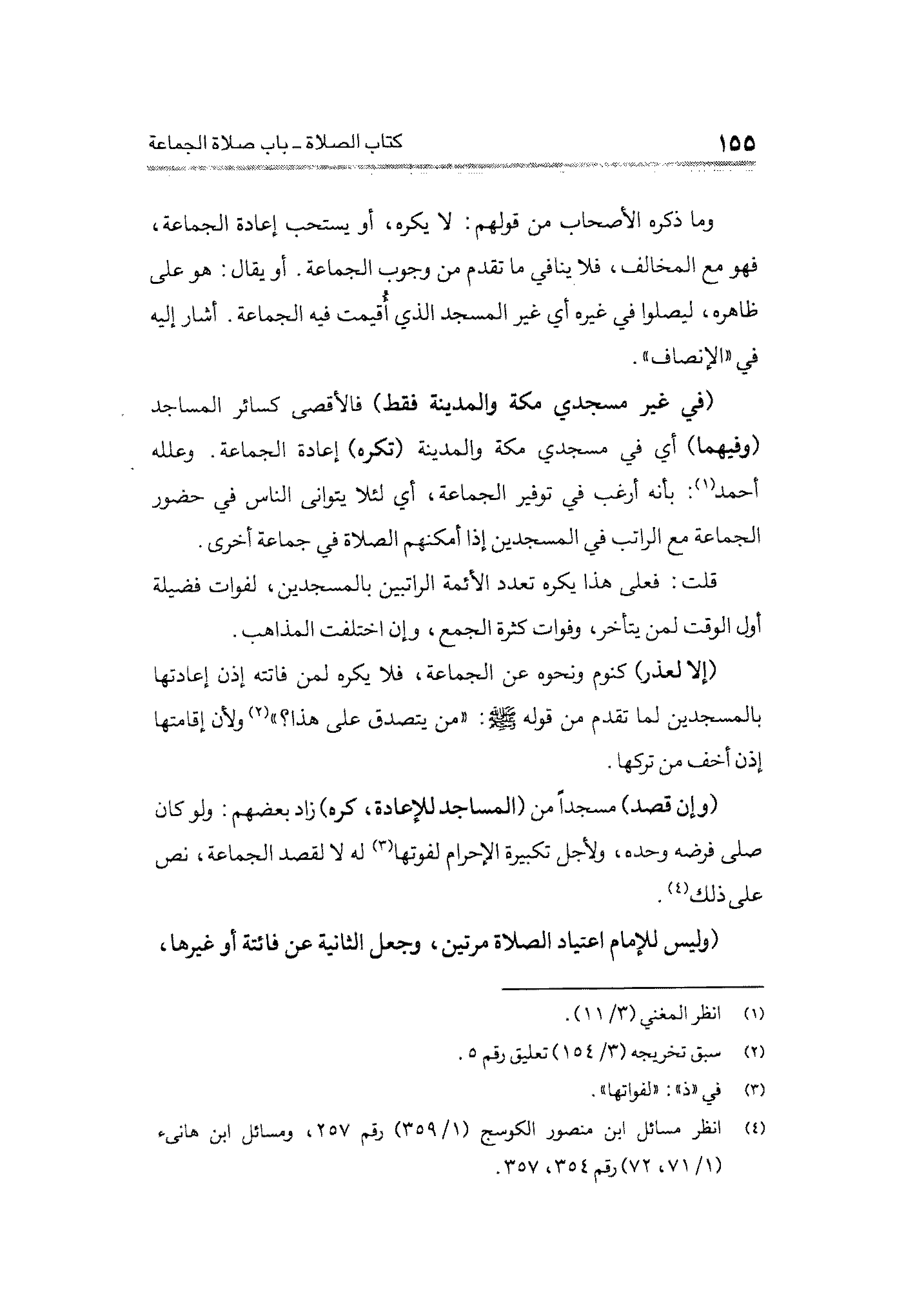 (في غير مسجدي مكة والمدينة فقط) فالأقصى كسائر المساجد (وفيهما) أي في مسجدي مكة والمدينة (تكره) إعادة الجماعة. وعلله أحمد (¬١): بأنه أرغب في توقير الجماعة، أي لئلا يتوانى الناس في حضور الجماعة مع الراتب في المسجدين إذا أمكنهم الصلاة في جماعة أخرى.
