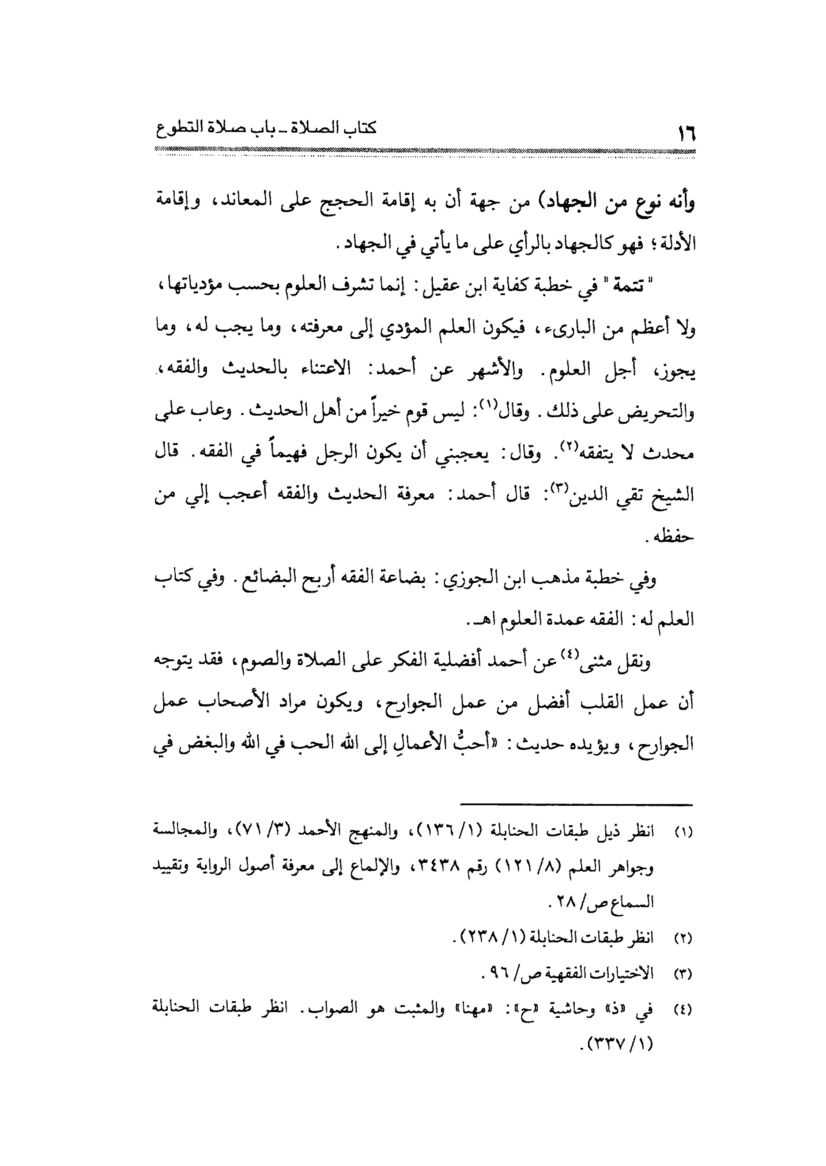 "تتمة" في خطبة كفاية ابن عقيل: إنما تشرف العلوم بحسب مؤدياتها، ولا أعظم من البارئ، فيكون العلم المؤدي إلى معرفته، وما يجب له، وما يجوز، أجل العلوم. والأشهر عن أحمد: الاعتناء بالحديث والفقه، والتحريض على ذلك. وقال (¬١): ليس قوم خيرًا من أهل الحديث. وعاب على محدث لا يتفقه (¬٢). وقال: يعجبني أن يكون الرجل فهيمًا في الفقه. قال الشيخ تقي الدين (¬٣): قال أحمد: معرفة الحديث والفقه أعجب إلي من حفظه.