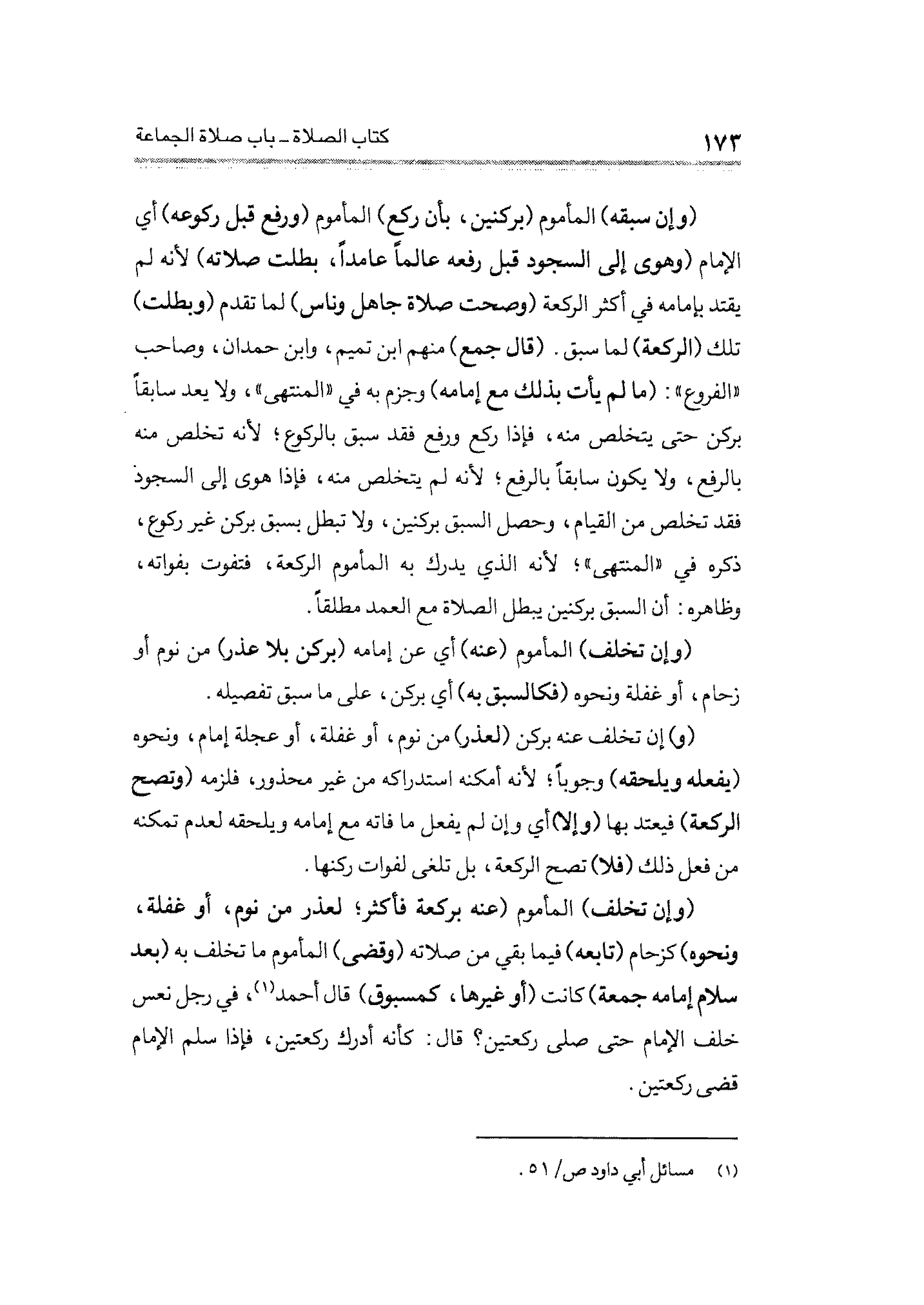 (وإن سبقه) المأموم (بركنين، بأن ركع) المأموم (ورفع قبل ركوعه) أي الإمام (وهوى إلى السجود قبل رفعه عالمًا عامدًا، بطلت صلاته) لأنه لم يقتد بإمامه في أكثر الركعة (وصحت صلاة جاهل وناس) لما تقدم (وبطلت) تلك (الركعة) لما سبق. (قال جمع) منهم ابن تميم، وابن حمدان، وصاحب "الفروع": (ما لم يأت بذلك مع إمامه) وجزم به في "المنتهى"، ولا يعد سابقًا بركن حتى يتخلص منه، فإذا ركع ورفع فقد سبق بالركوع؛ لأنه تخلص منه بالرفع، ولا يكون سابقًا بالرفع؛ لأنه لم يتخلص منه، فإذا هوى إلى السجود فقد تخلص من القيام، وحصل السبق بركنين، ولا تبطل بسبق بركن غير ركوع، ذكره في "المنتهي"؛ لأنه الذي يدرك به المأموم الركعة، فتفوت بفواته، وظاهره: أن السبق بركنين يبطل الصلاة مع العمد مطلقًا.